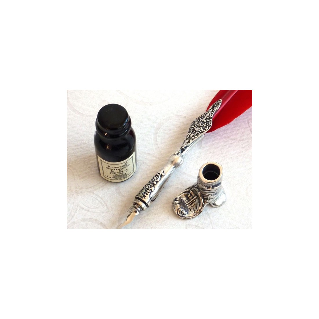 Elevate your writing style with another one of our ornate pewter calligraphy pen sets. This is a red coloured goose feather with a pewter quill. Complete with a boot style pen holder and a bottle of black ink. Made in Italy by La Kaligrafica.