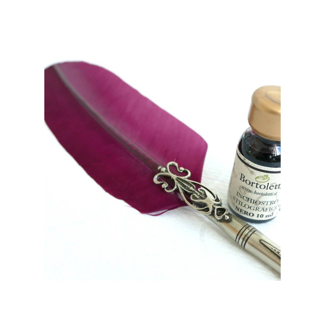Feather calligraphy dip pen, two nibs and ink. This set comprises a goose feather calligraphy dip pen with bronze nib holder plated in nickel silver, a standard bottle of ink and two antique nibs. Manufactured in Italy by Bortoletti Fonderia Artistica.