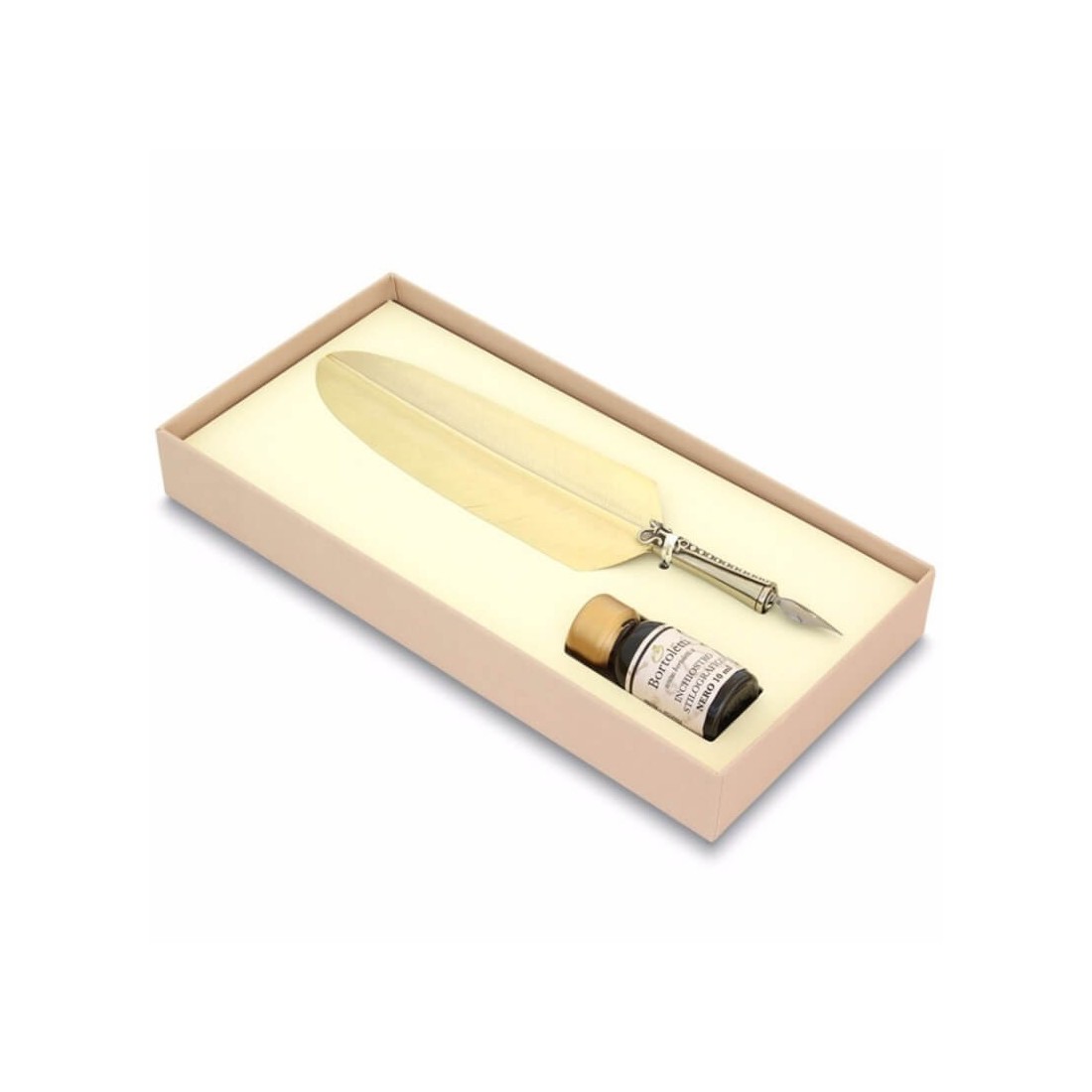 Feather calligraphy quill and ink. This set comprises a goose feather calligraphy quill with bronze nib holder plated in nickel silver and a standard bottle of ink. Manufactured in Italy by Bortoletti Fonderia Artistica.