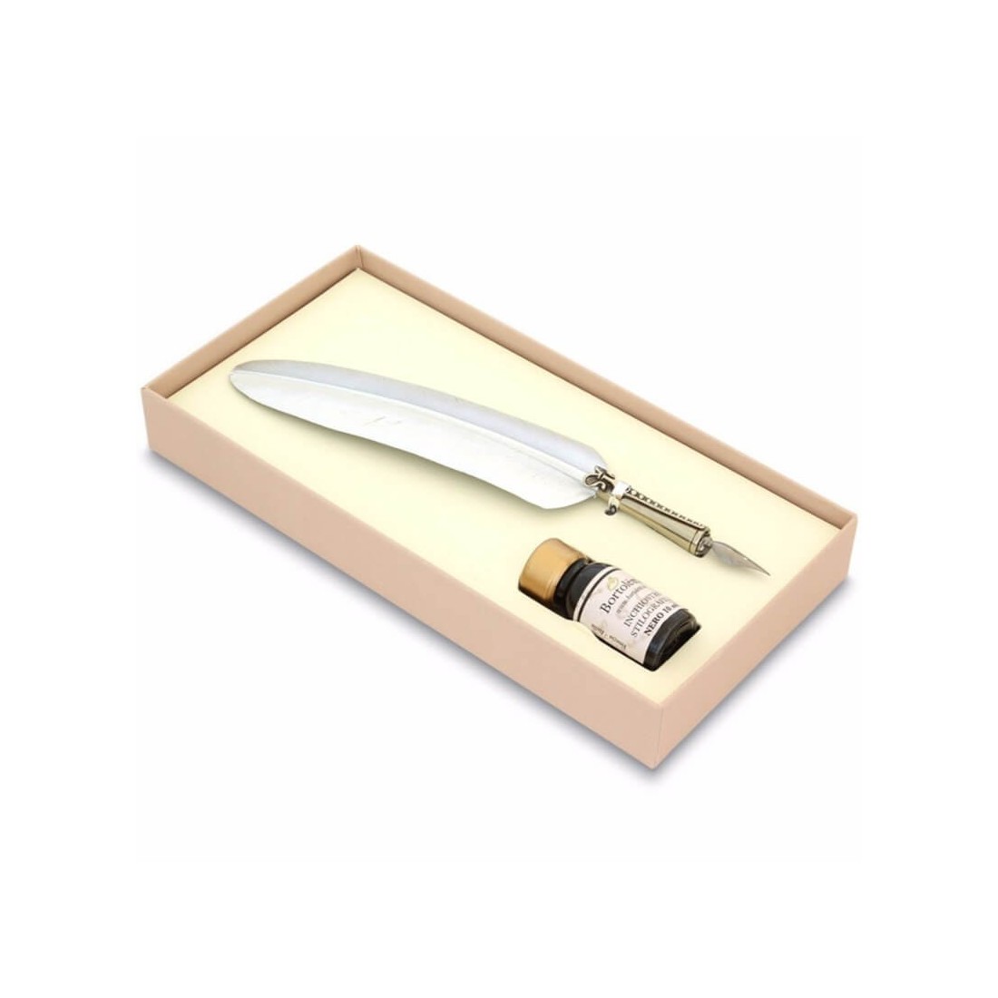 Feather calligraphy quill and ink. This set comprises a goose feather calligraphy quill with bronze nib holder plated in nickel silver and a standard bottle of ink. Manufactured in Italy by Bortoletti Fonderia Artistica.