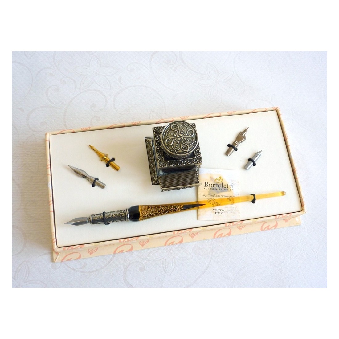Murano glass and Gold leaf pen set. A beautifully crafted, hand finished, calligraphy dip pen set. Comprises a glass & nickle silver plated bronze dip pen, four nibs and an ornate inkwell. Available in a range of colours. Manufactured in Italy by Bortoletti Fonderia Artistica.