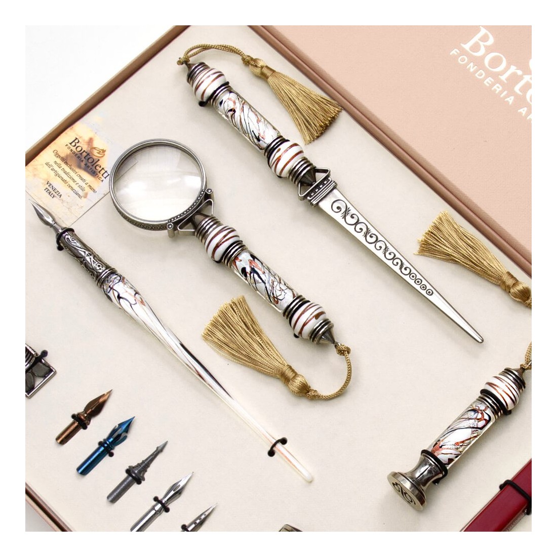 This elegant desk set is perfect for calligraphers and anyone who appreciates beautiful objects. It includes a Murano glass calligraphy pen, a white bronze letter opener, a magnifying glass, a seal, and sealing wax in a variety of colours. All pieces are made from high-quality materials and are well-made with attention to detail.