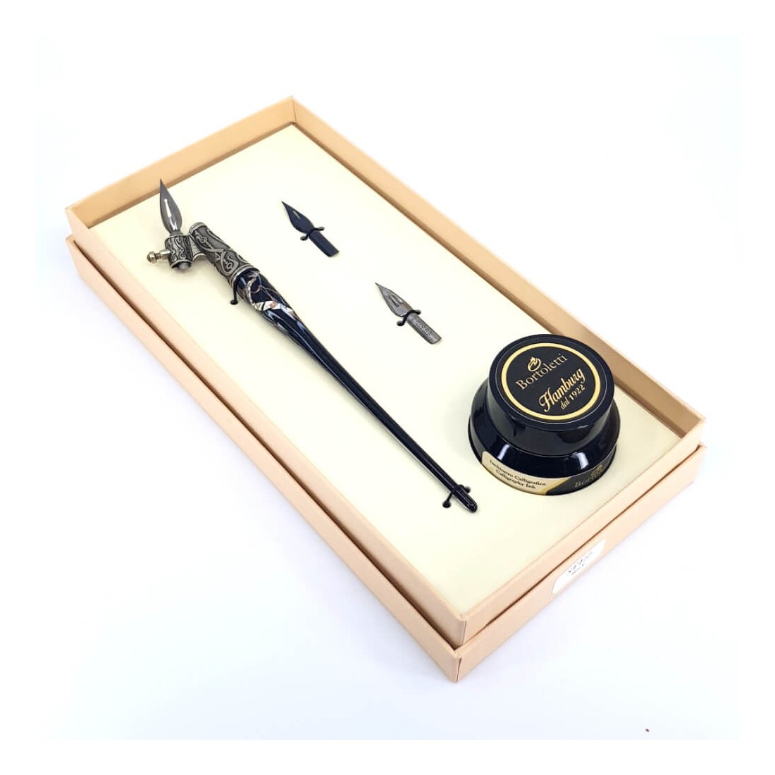 A beautifully crafted, hand finished, calligraphy dip pen set, which comprises a Murano glass pen with silver leaf flakes, three nibs and a bottle of ink. The bronze holder supports a variety of nibs which are held gently in place by a screw fixing. Available in a range of wonderful colours.