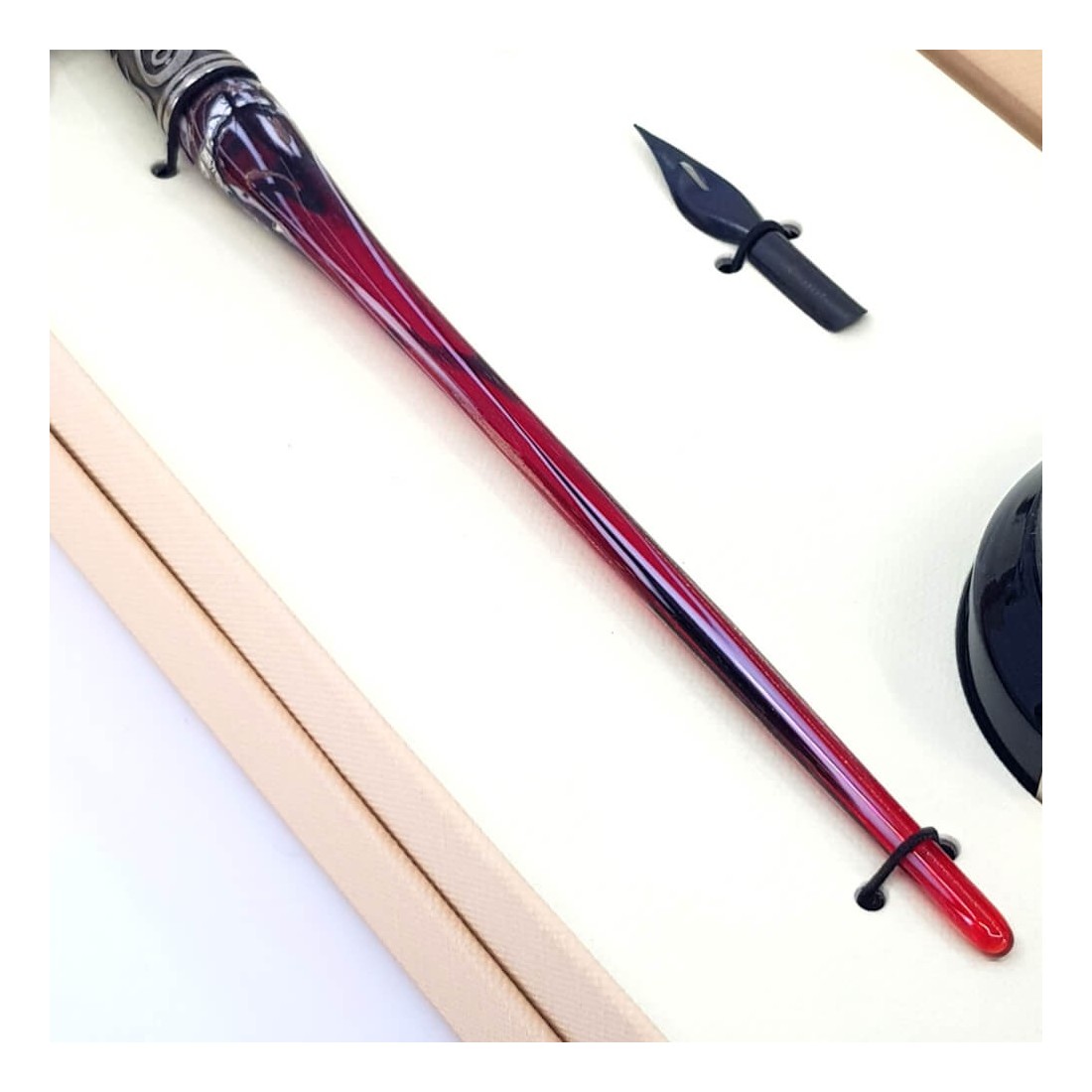 A beautifully crafted, hand finished, calligraphy dip pen set, which comprises a Murano glass pen with silver leaf flakes, three nibs and a bottle of ink. The bronze holder supports a variety of nibs which are held gently in place by a screw fixing. Available in a range of wonderful colours.