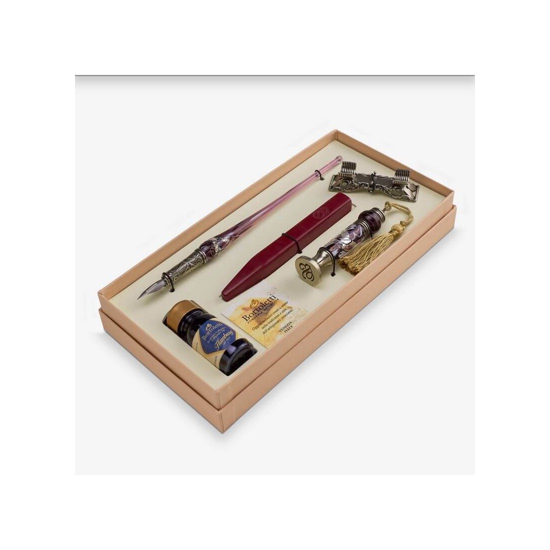 The Leopardi calligraphy set is one of the flagships of the Bortoletti collection, and it is easy to see why. The pen is made from high-quality Murano glass, and the pen holder is made from hand-worked white bronze. The seal is also made from Murano glass, and it comes with a wide variety of interchangeable letters and symbols.