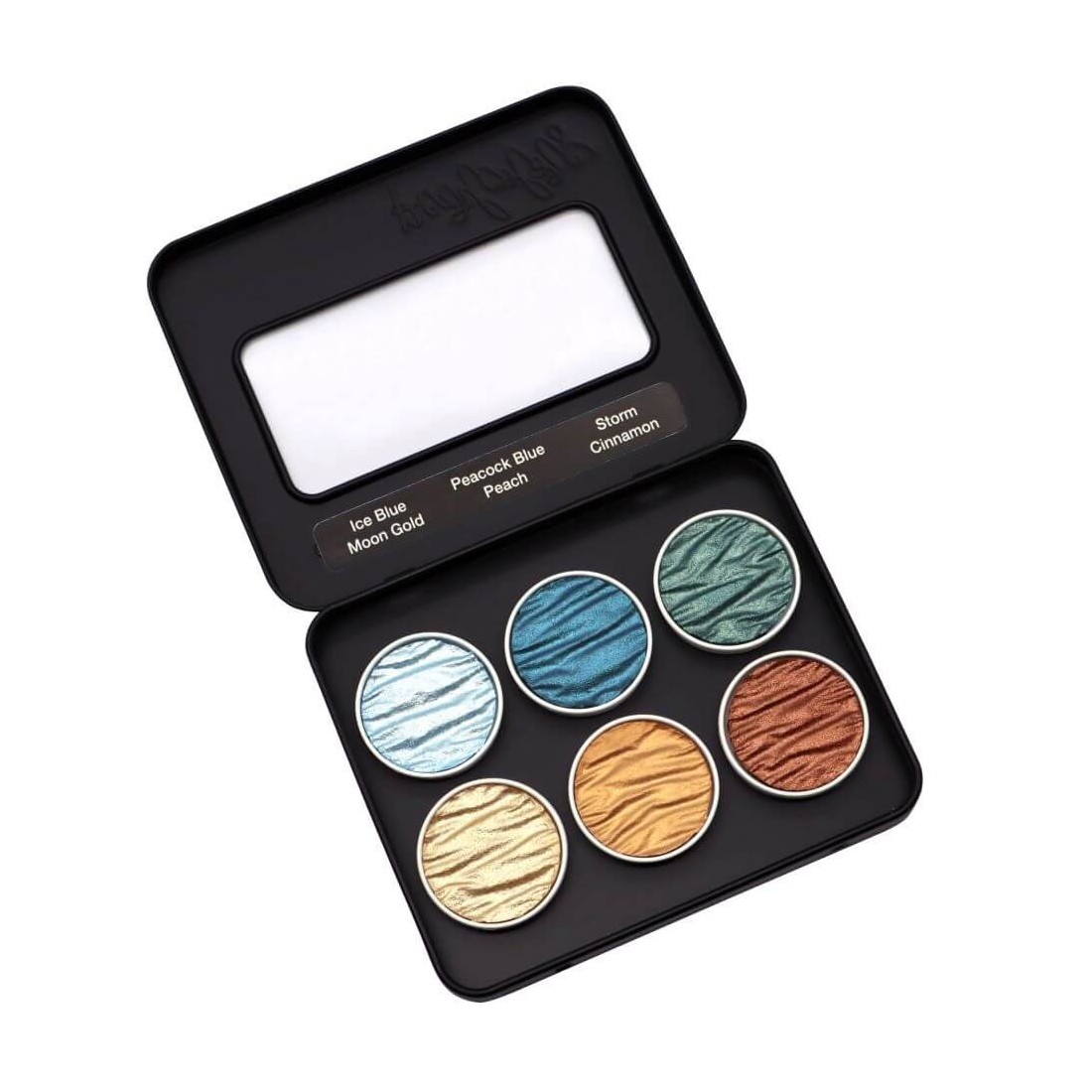Metal case contains the Pearlcolors Ice Blue, Peacock Blue, Storm, Moon Gold, Peach and Cinnamon.