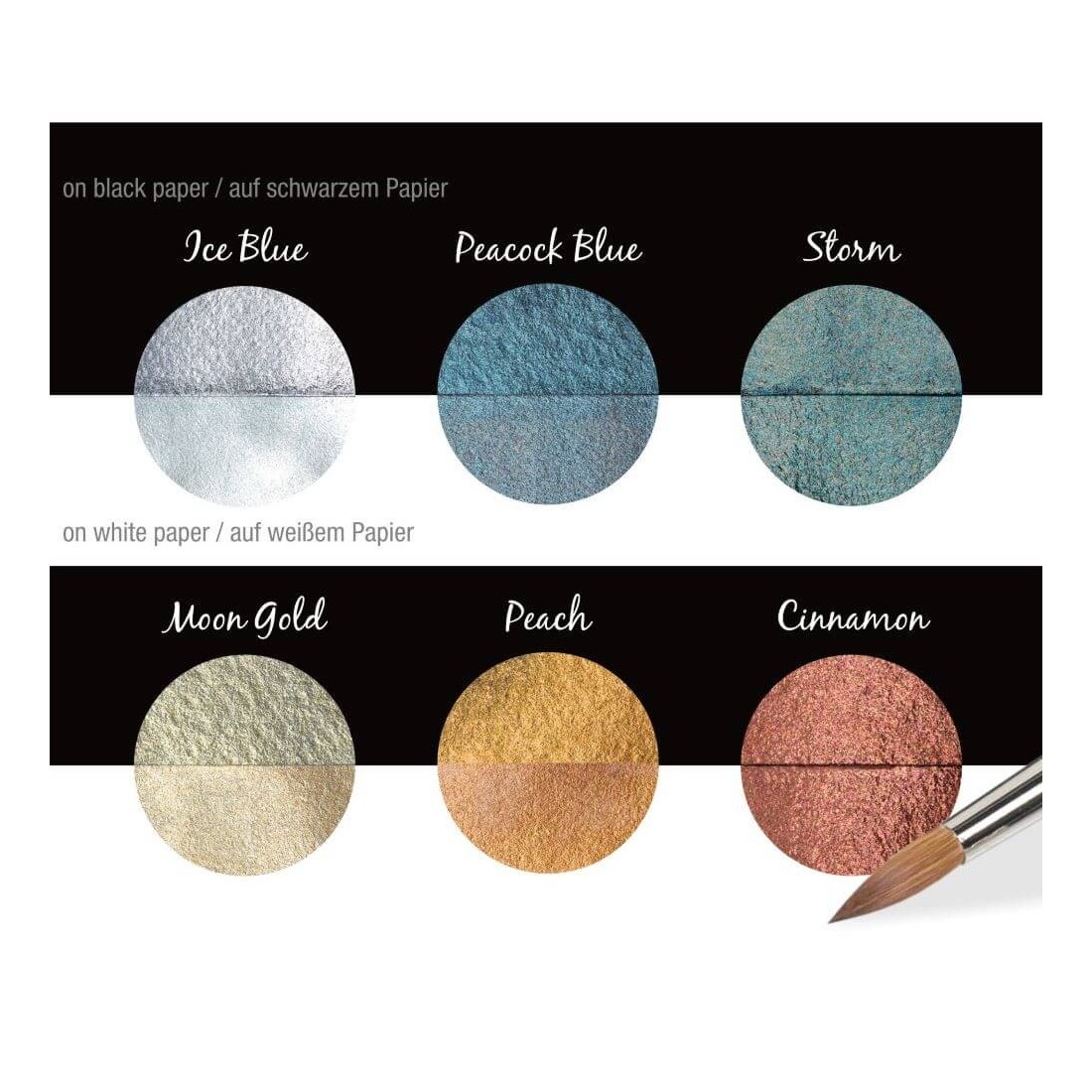 Made of mica, a natural mineral that offers a wide variety of metallic shades, from gold and silver to iridescent, shining pearl colours. Activate with a little water on the palette and apply to the nib with a brush. Adheres to all absorbent surfaces, such as paper, wood, gypsum, etc.
