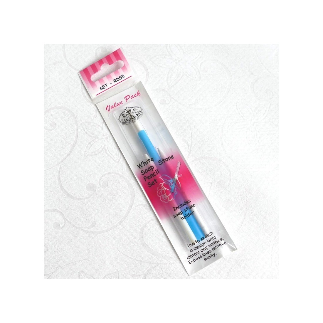White soap stone pencil set. Value pack that contains three pencils and a soap stone holder. Use to sketch a design onto almost any surface. Excess lines are removed very easily. Great for crafters and calligraphers who wish to design on dark paper.