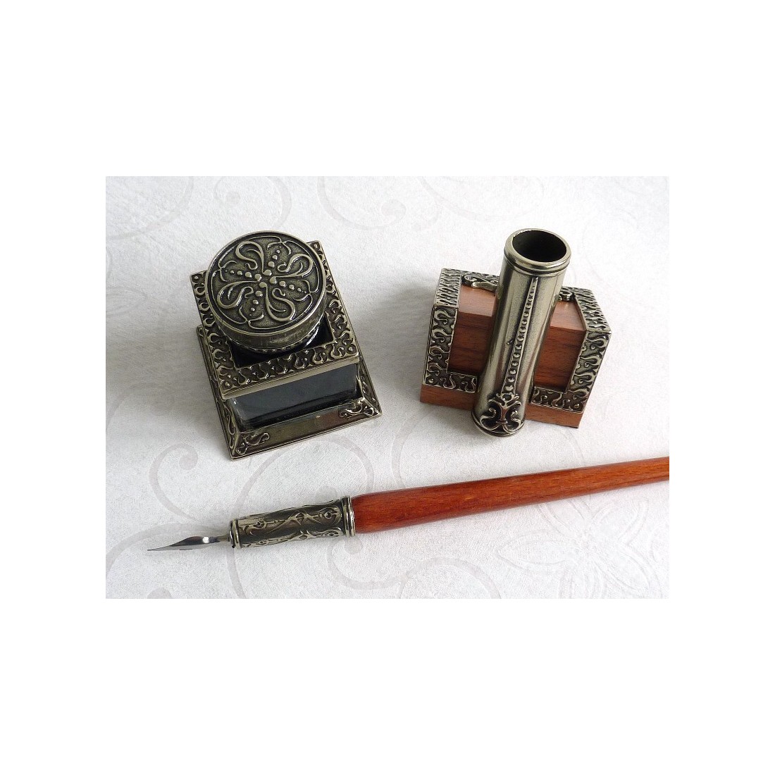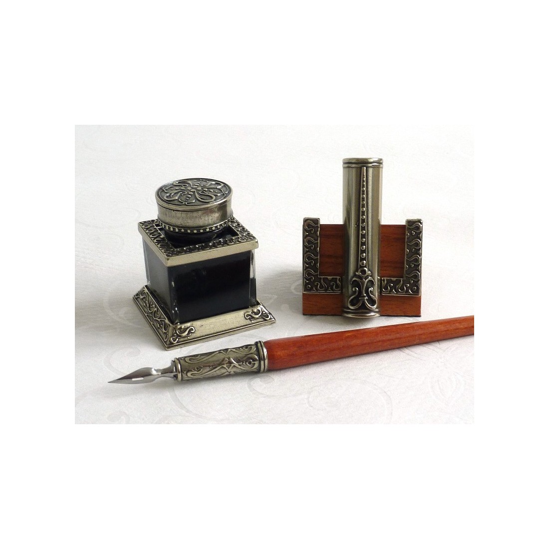 Wooden dip pen, inkwell & pen holder. This set comprises a wooden pen with bronze nib holder plated in nickel silver and an inkwell. Nickel silver and wood together with taste and simplicity. The nickle silver decoration enriches the wooden pen, inkwell and the pen holder. An essential desk set with pen, inkwell and pen holder.