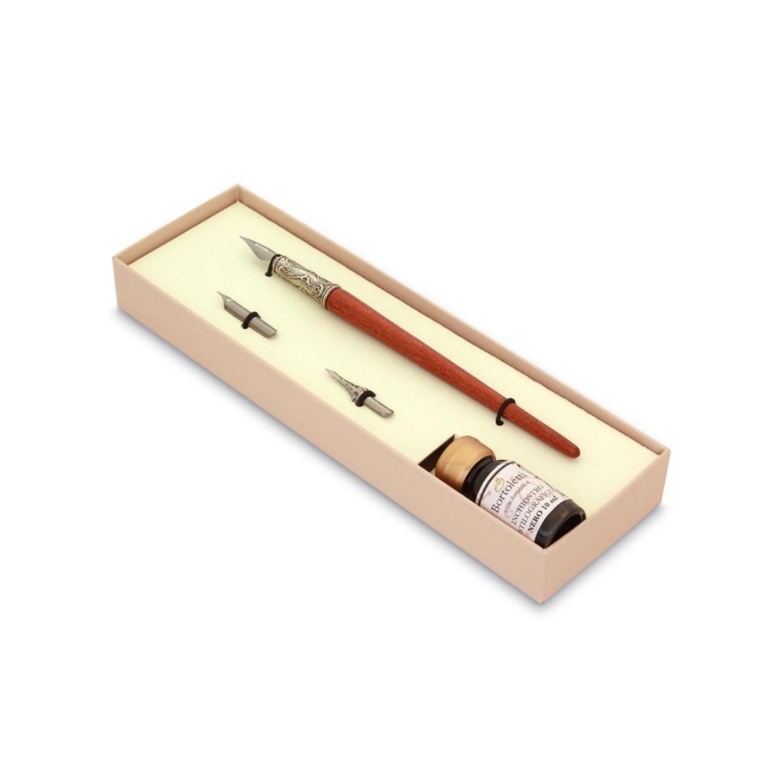 Wooden pen with a bronze nib holder. Great value and sophistication. Set comprises a wood and bronze calligraphy dip pen, a bottle of ink and three nibs.. Made in Italy by Bortoletti Fonderia Artistica.