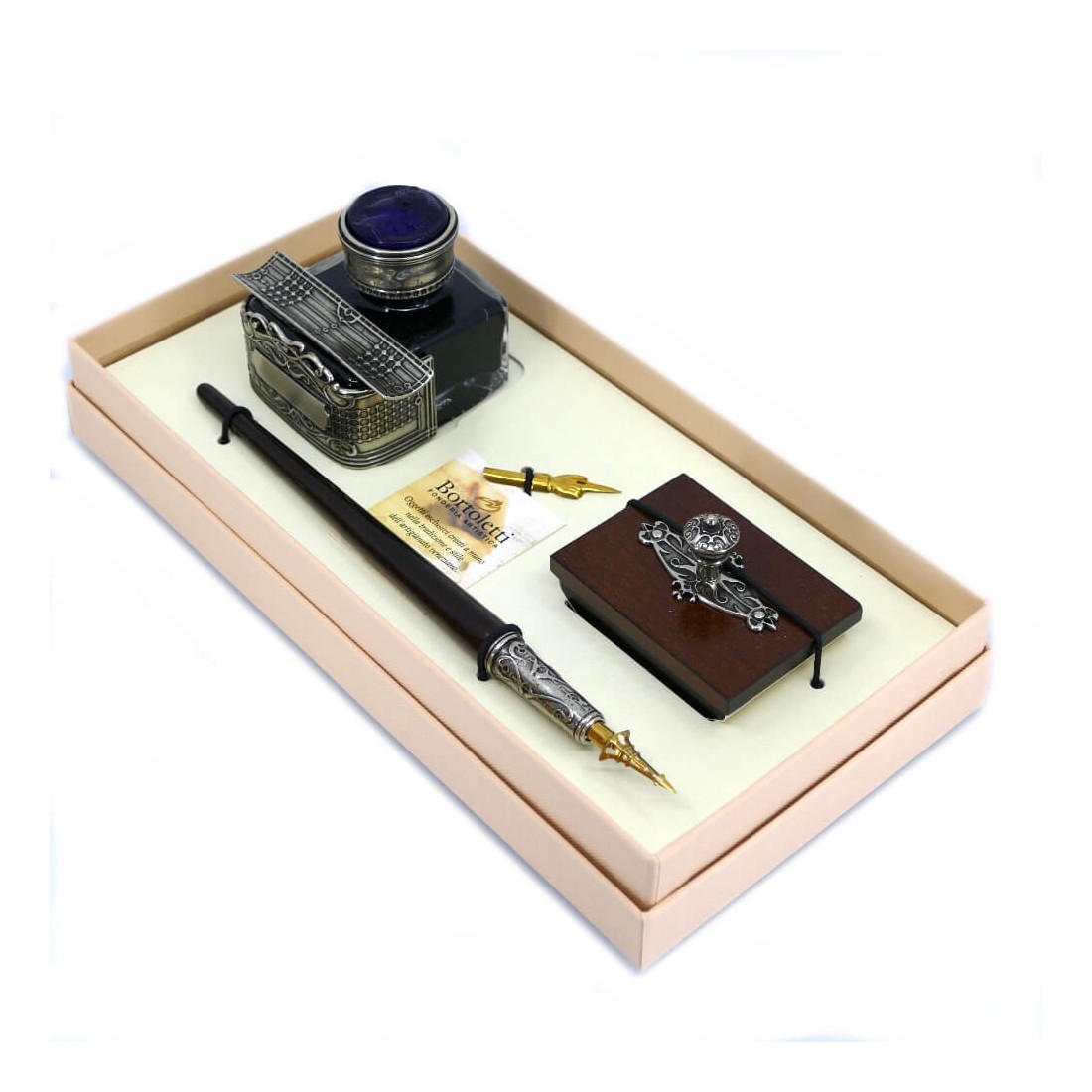 Quality oozes with this magnificent calligraphy dip pen set, which comprises a wooden calligraphy dip pen, glass inkwell with a glass cameo lid with an integrated bronze pen holder. This set also has an ink blotter to dry and improve your writing.