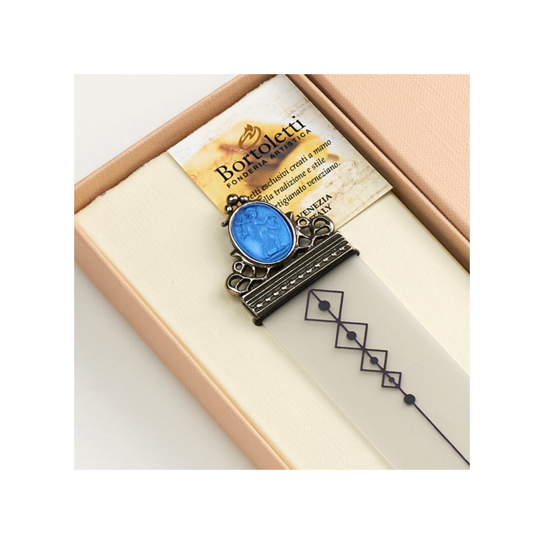 Un marcapáginas hecho a mano para un público con clase que es el resultado de la continua investigación de Bortoletti y sus maestros joyeros en el campo del diseño. El procesamiento de la pasta de vidrio es único y se transmite de generación en generación por los maestros vidrieros de Murano.