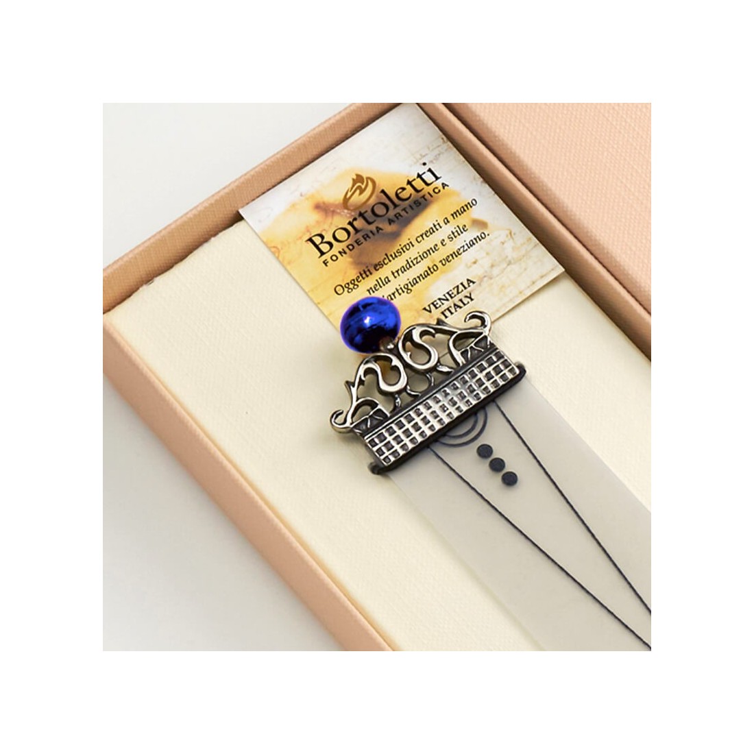 Marcador con decoración de bronce blanco adornado con una perla de cristal de Murano de colores para mantener la marca. El fuego, el cristal de Murano y las manos de nuestros maestros artesanos son la energía generadora de nuestros productos.