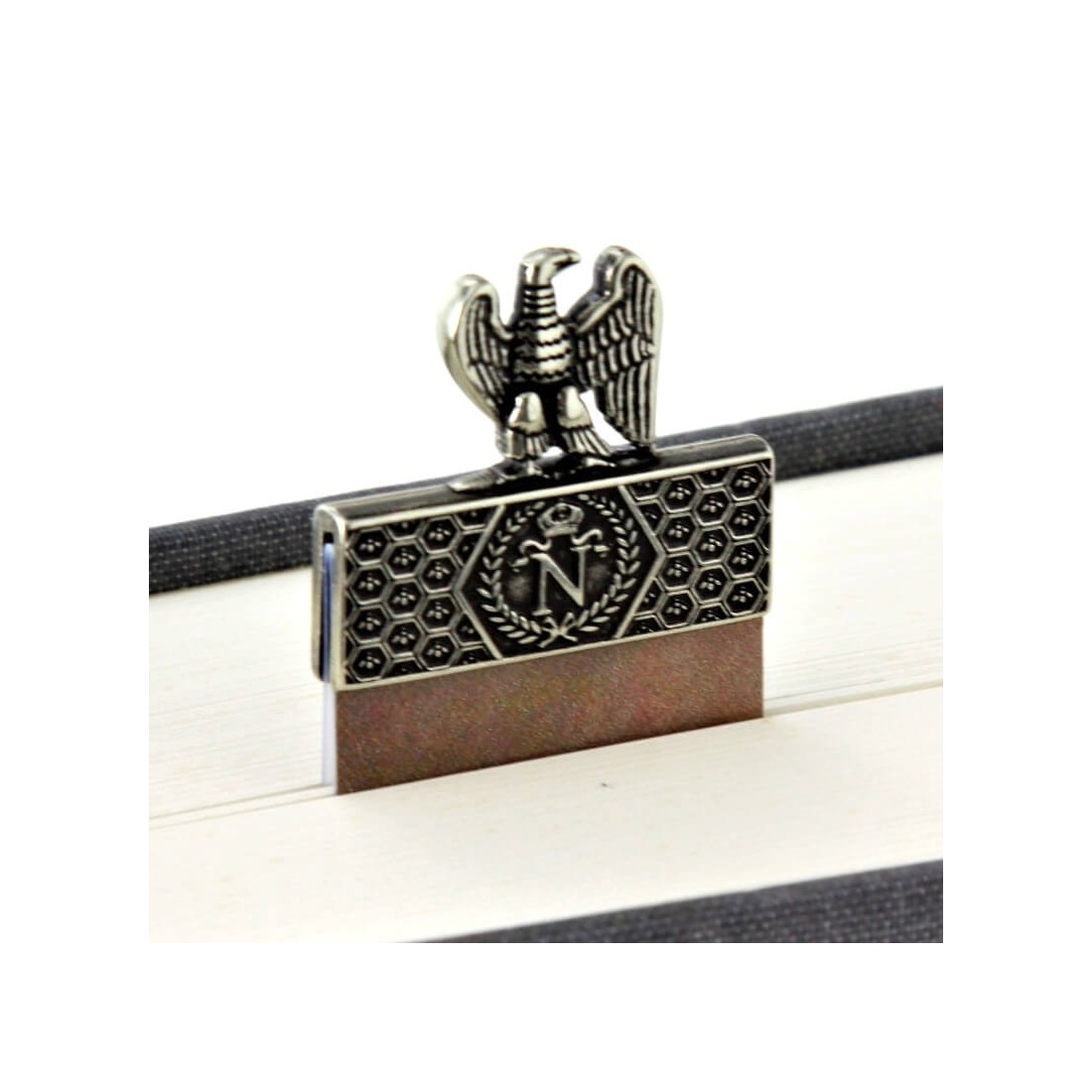 Un marcapáginas original con un friso que representa el emblema napoleónico grabado con abejas, símbolo de la inmortalidad. Las abejas fueron descubiertas en 1653 en Tournai en la tumba de Childerico I, fundador en 457 de la dinastía merovingia.