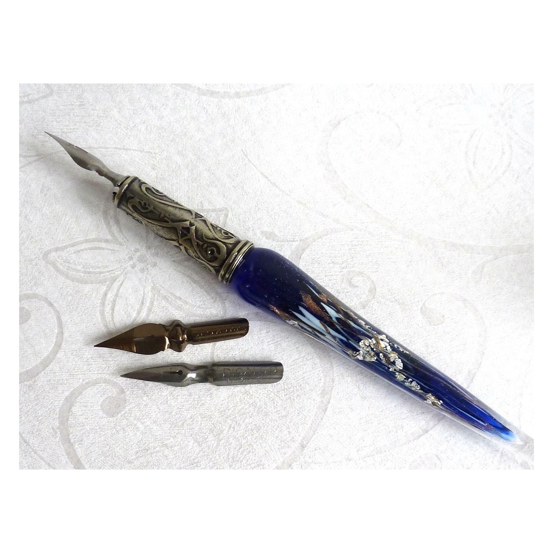 Un maravillosamente hecho a mano, acabado a mano, juego de plumilla de caligrafía, que comprende una pluma de cristal de Murano con las escamas de la hoja de plata, tres puntas y una botella de tinta. Disponible en una gama de colores maravillosos.