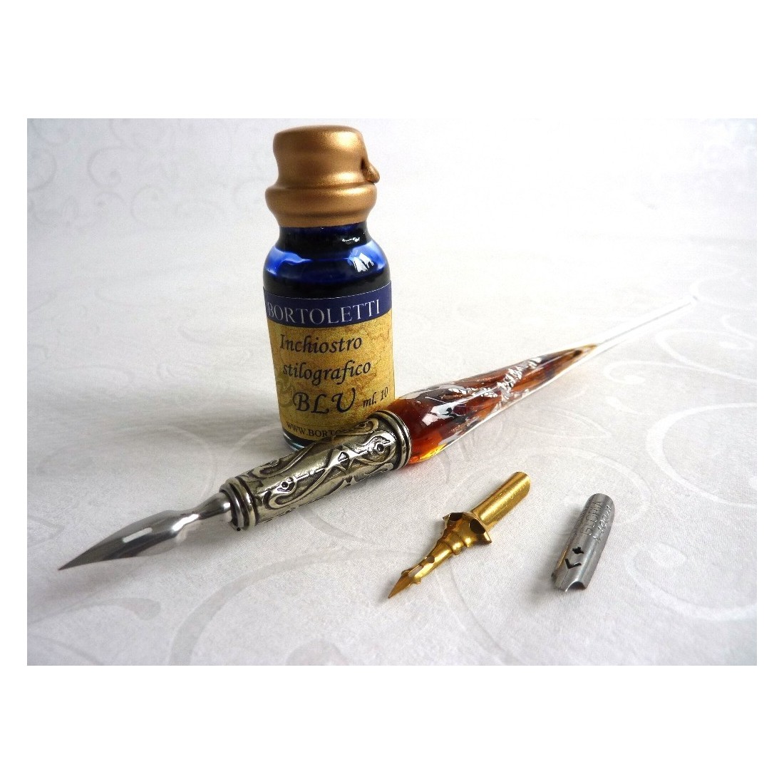 Un maravillosamente hecho a mano, acabado a mano, juego de plumilla de caligrafía, que comprende una pluma de cristal de Murano con las escamas de la hoja de plata, tres puntas y una botella de tinta. Disponible en una gama de colores maravillosos.