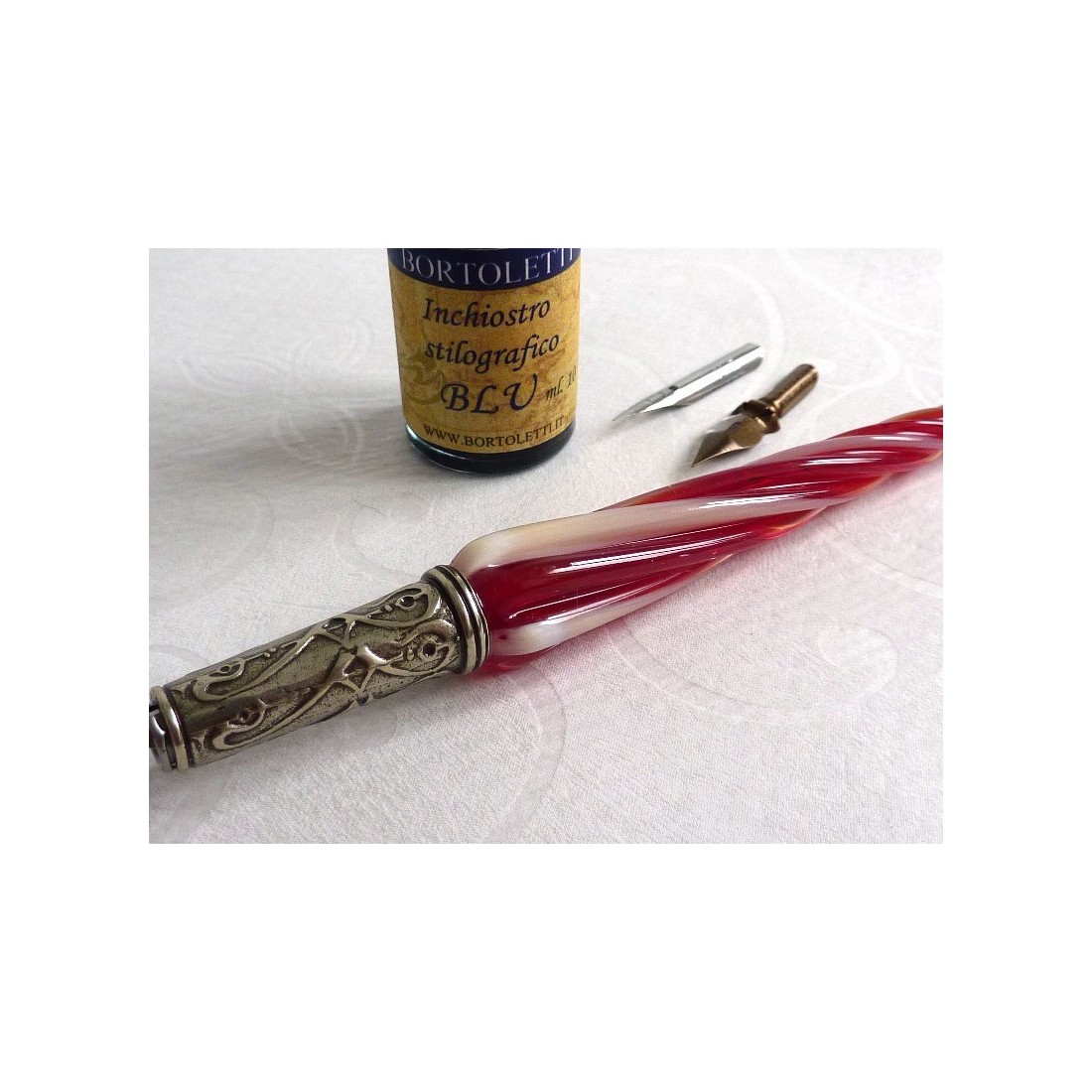 Una pluma de vidrio trenzado veneciana. Maravillosamente hecho a mano, acabado a mano, lápiz de caligrafía establecido para aquellos que aman el estilo y la elegancia de Venecia. Se compone de un cuerpo de vidrio trenzado con una pluma de plata de níquel, tres puntas y una botella de tinta. Disponible en una gama de colores. Fabricado en Italia por Bortoletti Fonderia Artistica.