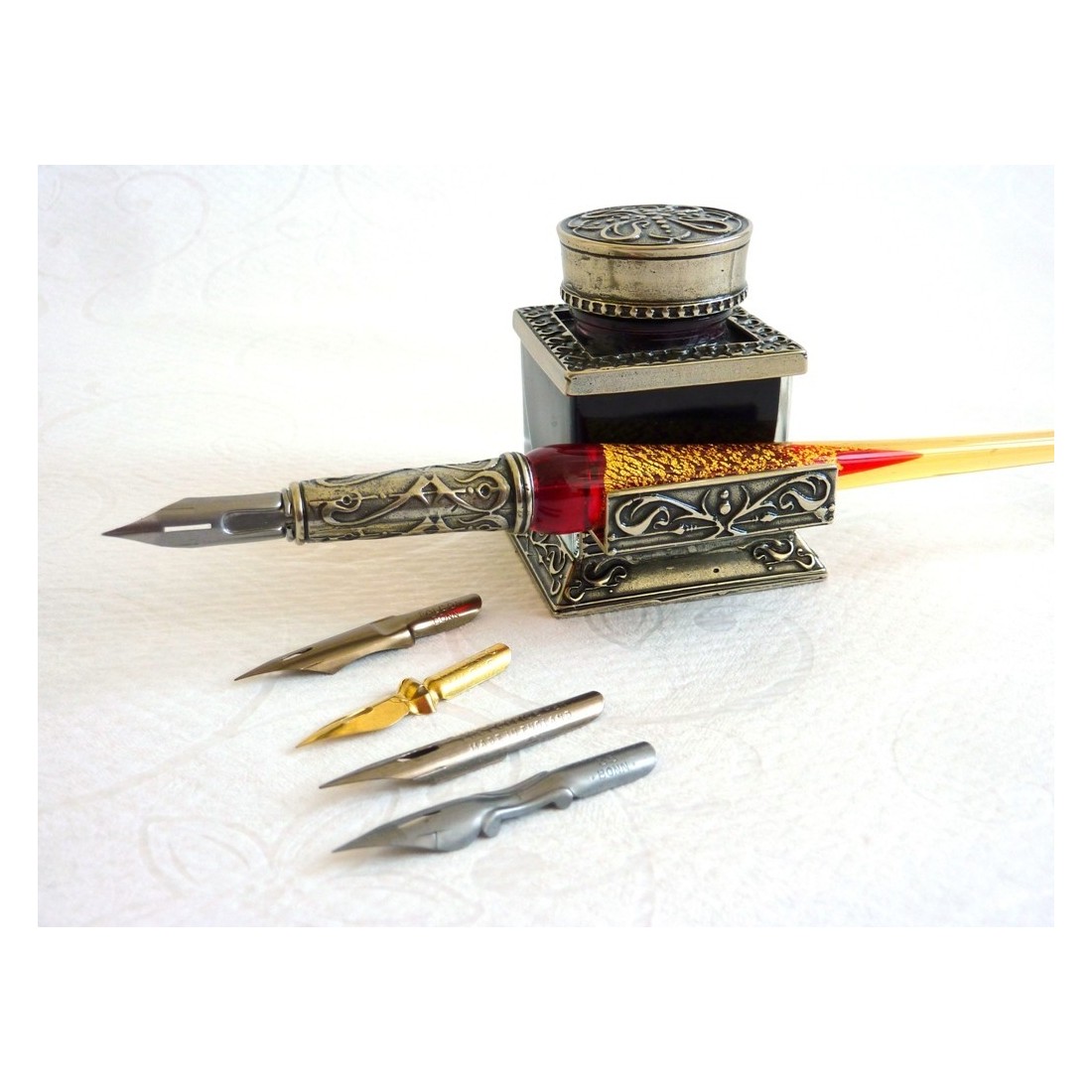 Un maravillosamente hecho a mano, acabado a mano, pluma de la inmersión caligrafía conjunto con cristal de Murano y pan de oro. Se compone de un cristal y plata de níquel plateado, plumilla de bronce, cuatro plumas y un tintero adornado. Disponible en una gama de colores maravillosos.