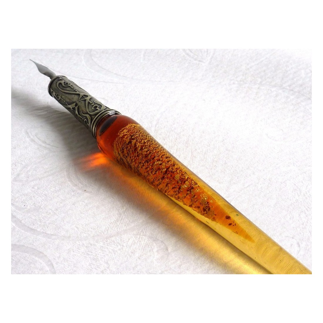 Un juego de rotuladores de caligrafía bellamente elaborado y acabado a mano. Consta de un bolígrafo de cristal de Murano con hojuelas de pan de oro, tres puntas y una botella de tinta. Disponible en una gama de maravillosos colores.