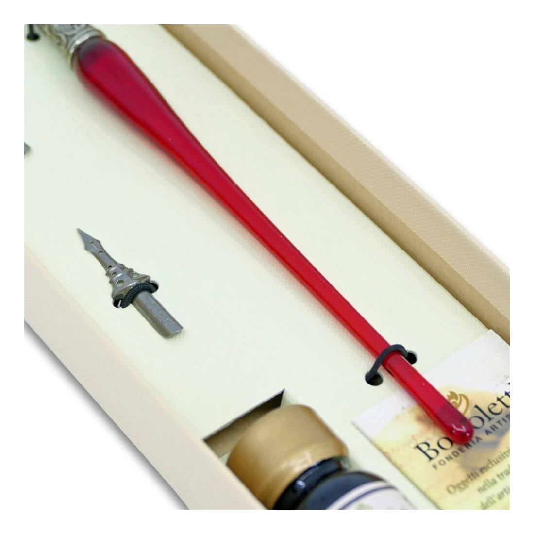 Un bolígrafo de caligrafía de vidrio simple, hecho de cristal de Murano y bronce bañado en níquel plateado. Completo con dos puntas adicionales y una botella de 10 ml de tinta a base de agua. Elija entre nueve maravillosos colores de vidrio.