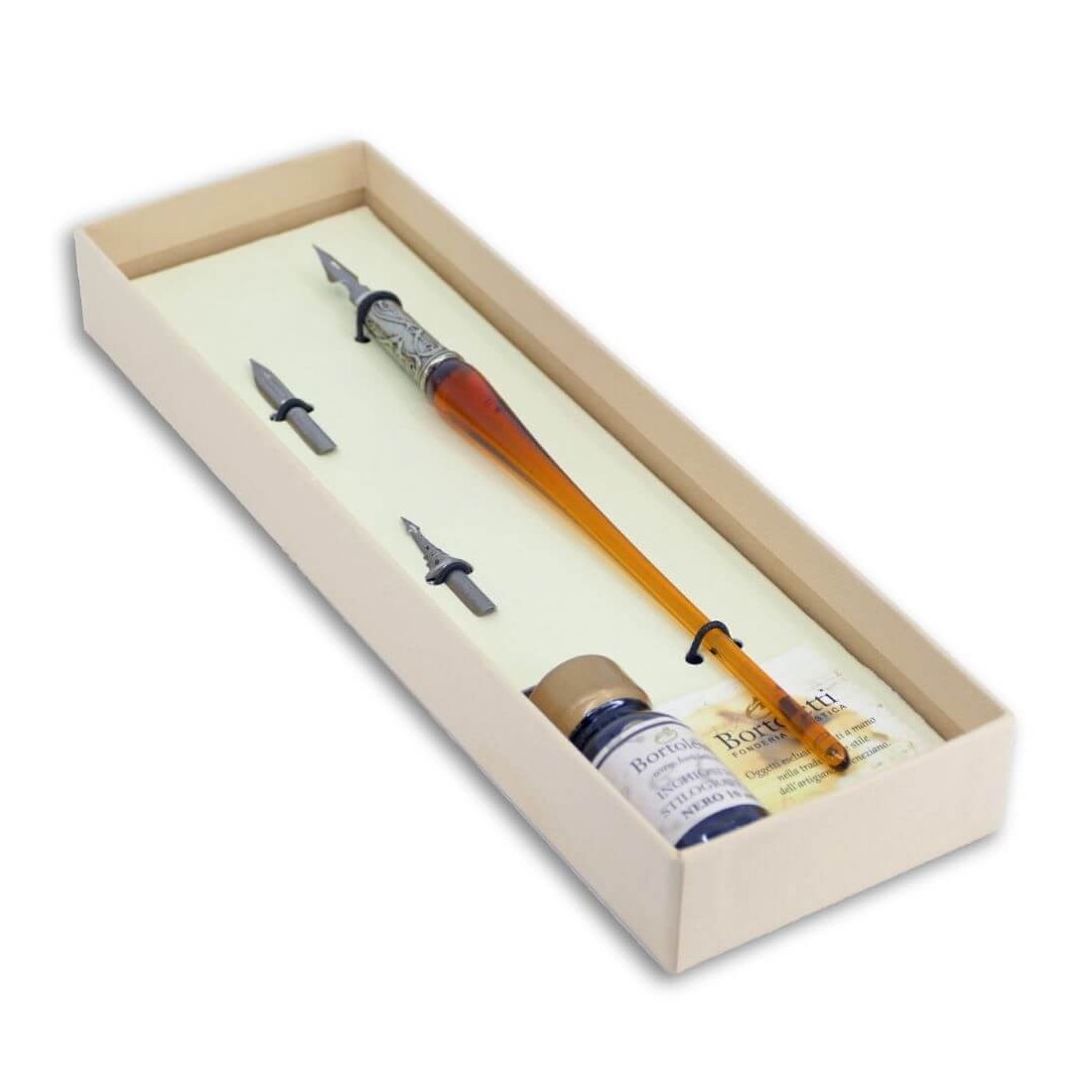 Un bolígrafo de caligrafía de vidrio simple, hecho de cristal de Murano y bronce bañado en níquel plateado. Completo con dos puntas adicionales y una botella de 10 ml de tinta a base de agua. Elija entre nueve maravillosos colores de vidrio.