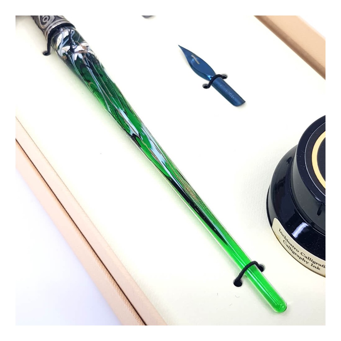 Un juego de bolígrafos de caligrafía bellamente elaborados y acabados a mano, que consta de un bolígrafo de cristal de Murano con hojuelas de hoja de plata, tres puntas y una botella de tinta.