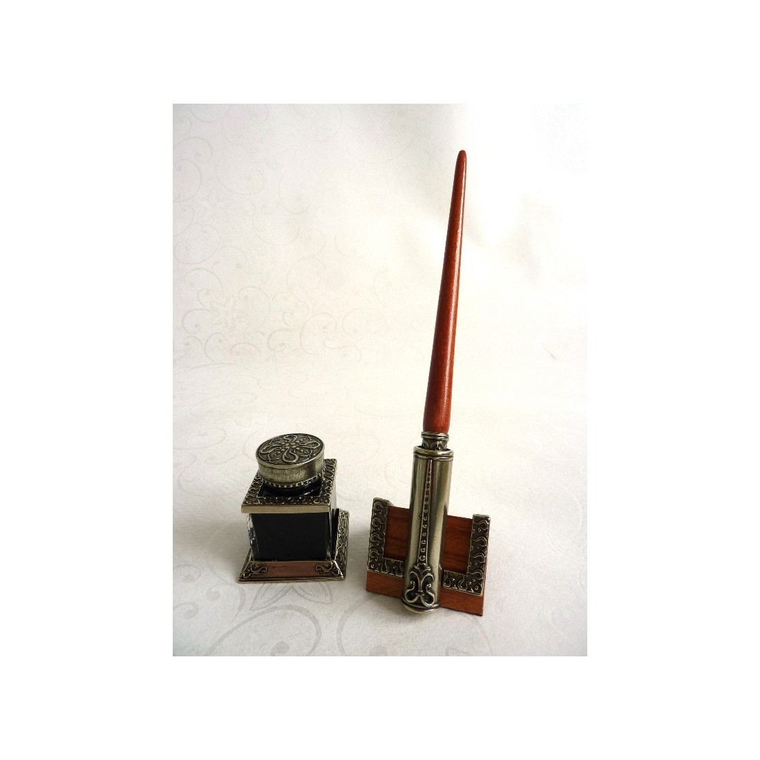 Pluma de caligrafía de madera, tintero y portaplumas. Este conjunto se compone de una pluma de madera con soporte de punta de bronce plateado en plata de níquel y un tintero. Níquel plata y madera junto con gusto y sencillez. La decoración níquel plata enriquece la pluma de madera, tintero y el titular de la pluma. Un escritorio esencial con la pluma, el tintero y el sostenedor de la pluma.