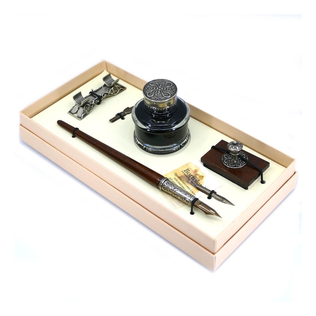 ¡Gran valor! Un magnífico juego de escritura compuesto por un bolígrafo de caligrafía de madera, un tintero de vidrio de 40 ml con tinta negra, un portalápices de bronce, un secante y tres puntas antiguas.
