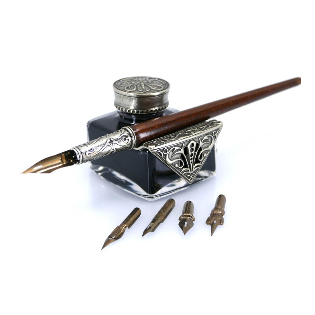 Un excelente juego de rotuladores de caligrafía, que consta de un rotulador de caligrafía de madera, un tintero de vidrio de alpaca con un portalápices de bronce integrado. Completo con cinco puntas antiguas.