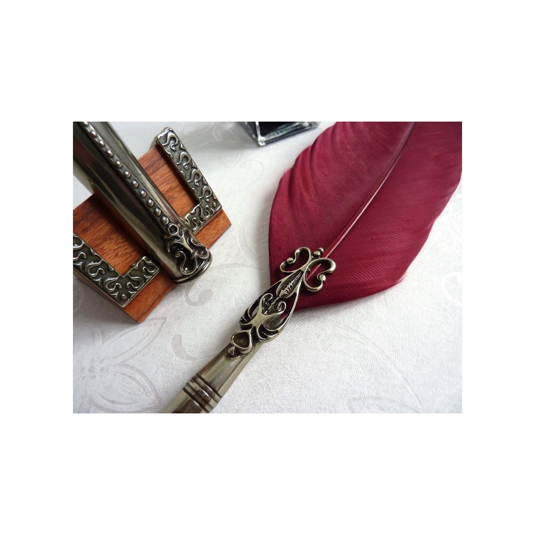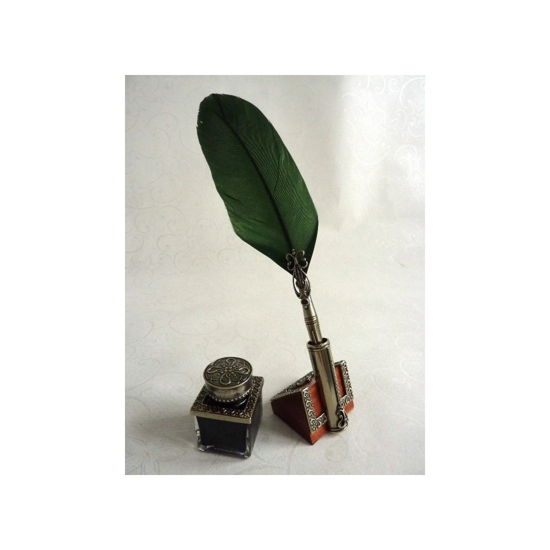 Pluma de pluma, tintero y portalápices. Este set se compone de un bolígrafo caligráfico de pluma de oca con plumín de bronce bañado en alpaca, tintero y portalápices, un pergamino con la historia de la escritura y un portalápices. La decoración de alpaca enriquece el bolígrafo, el tintero y el portalápices. Una elegante idea de regalo. Ideal para escribir tus pensamientos con estilo.