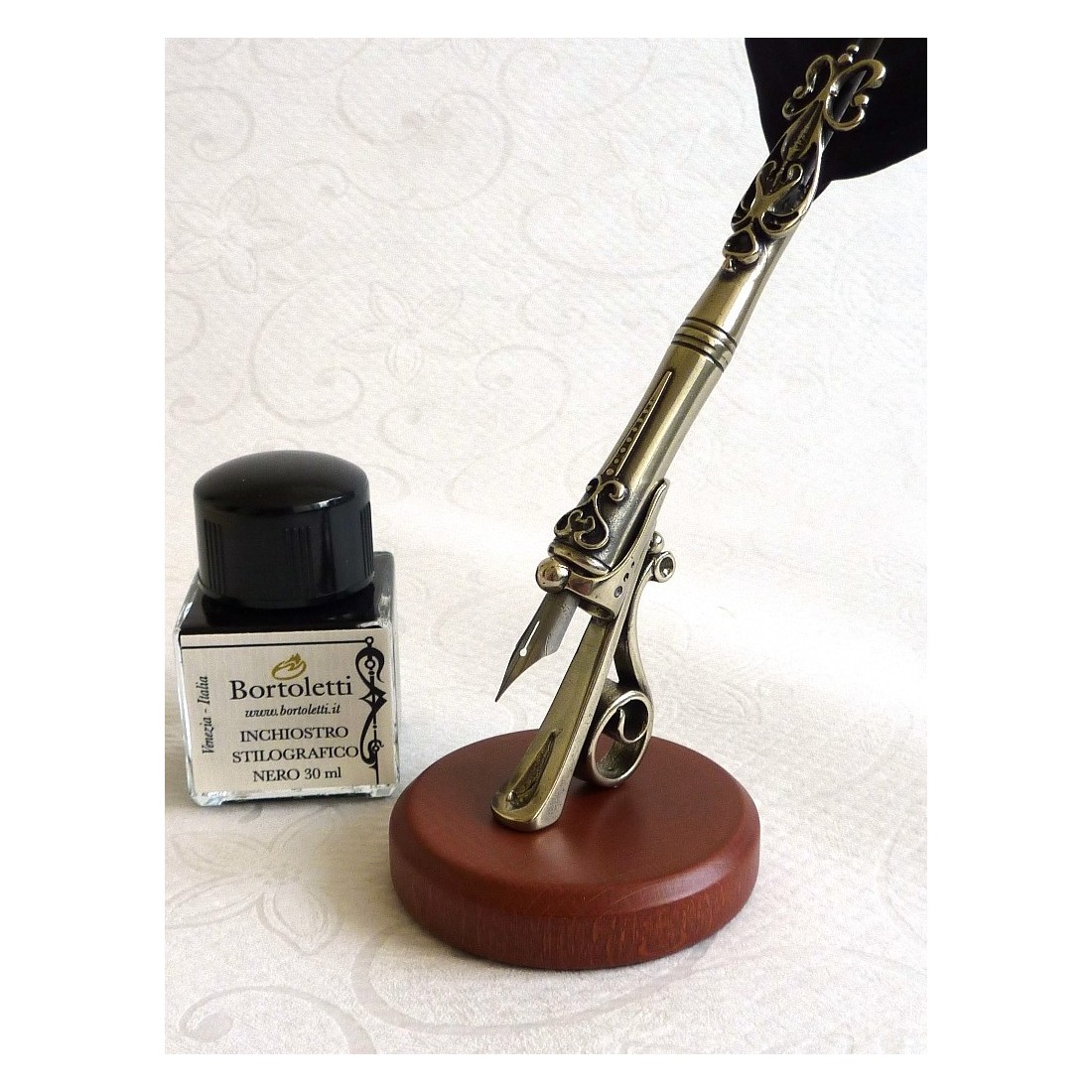 Bolígrafo de caligrafía de plumas, cinco puntas y un portalápices. Este juego consta de un bolígrafo de caligrafía de pluma de ganso con portapuntas de bronce chapado en alpaca, una botella grande de tinta, portaplumas de clave de sol y cinco puntas antiguas. Fabricado en Italia por Bortoletti Fonderia Artistica.