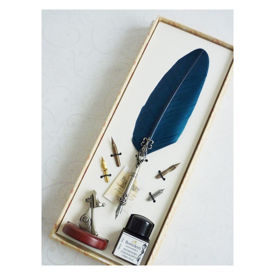 Bolígrafo de caligrafía de plumas, cinco puntas y un portalápices. Este juego consta de un bolígrafo de caligrafía de pluma de ganso con portapuntas de bronce chapado en alpaca, una botella grande de tinta, portaplumas de clave de sol y cinco puntas antiguas. Fabricado en Italia por Bortoletti Fonderia Artistica.