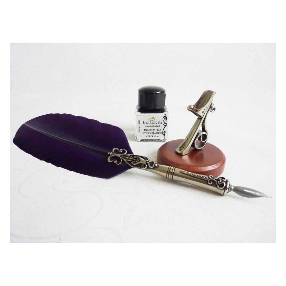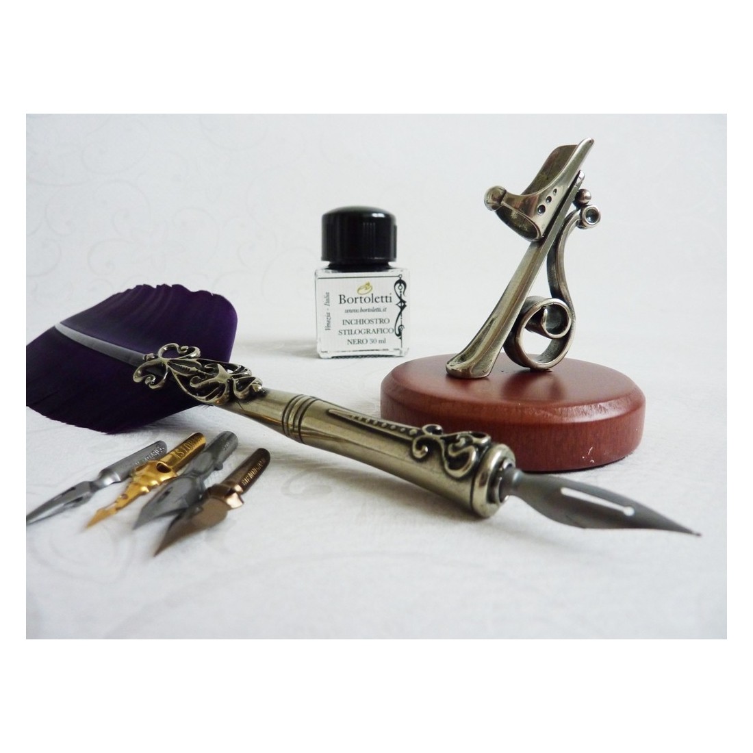 Bolígrafo de caligrafía de plumas, cinco puntas y un portalápices. Este juego consta de un bolígrafo de caligrafía de pluma de ganso con portapuntas de bronce chapado en alpaca, una botella grande de tinta, portaplumas de clave de sol y cinco puntas antiguas. Fabricado en Italia por Bortoletti Fonderia Artistica.