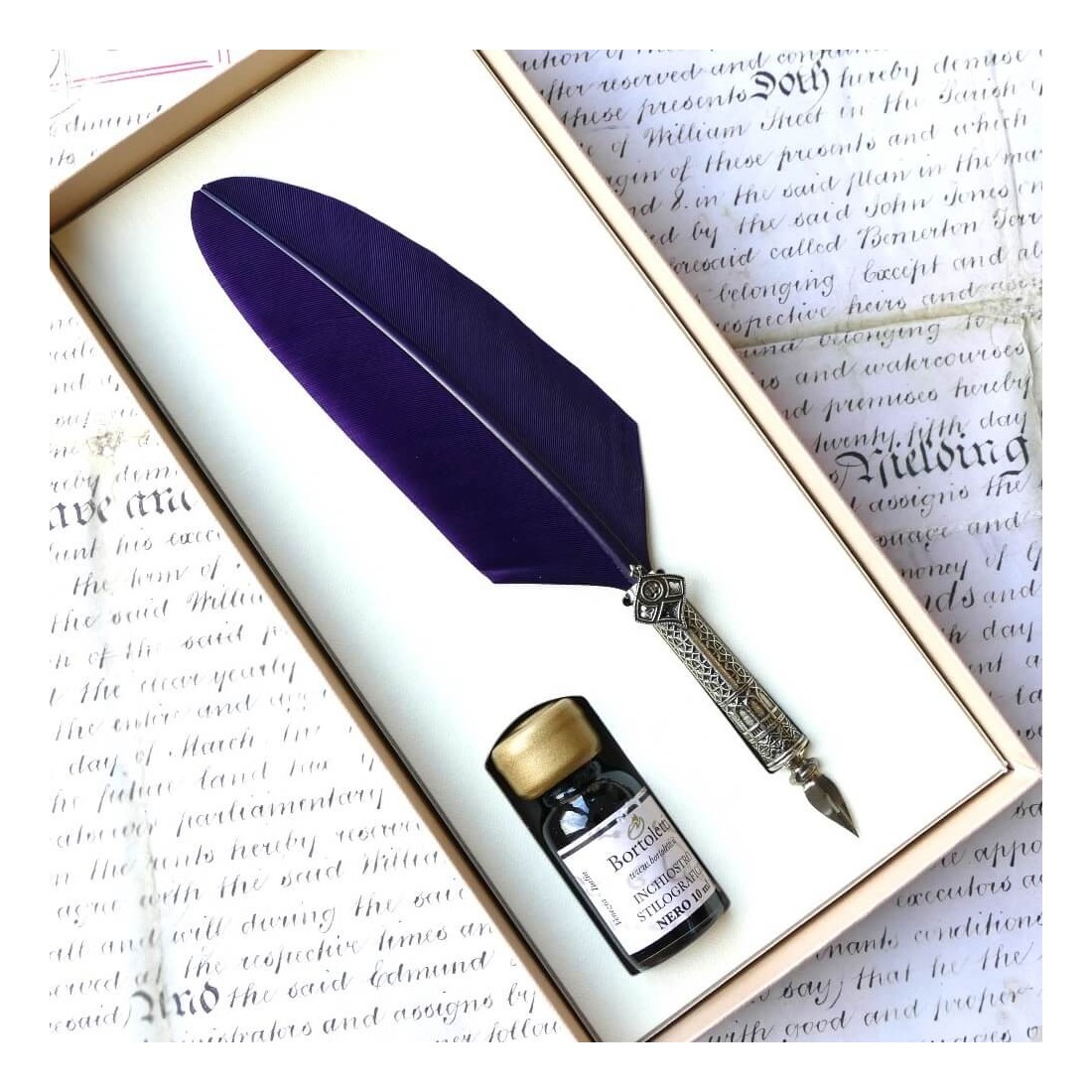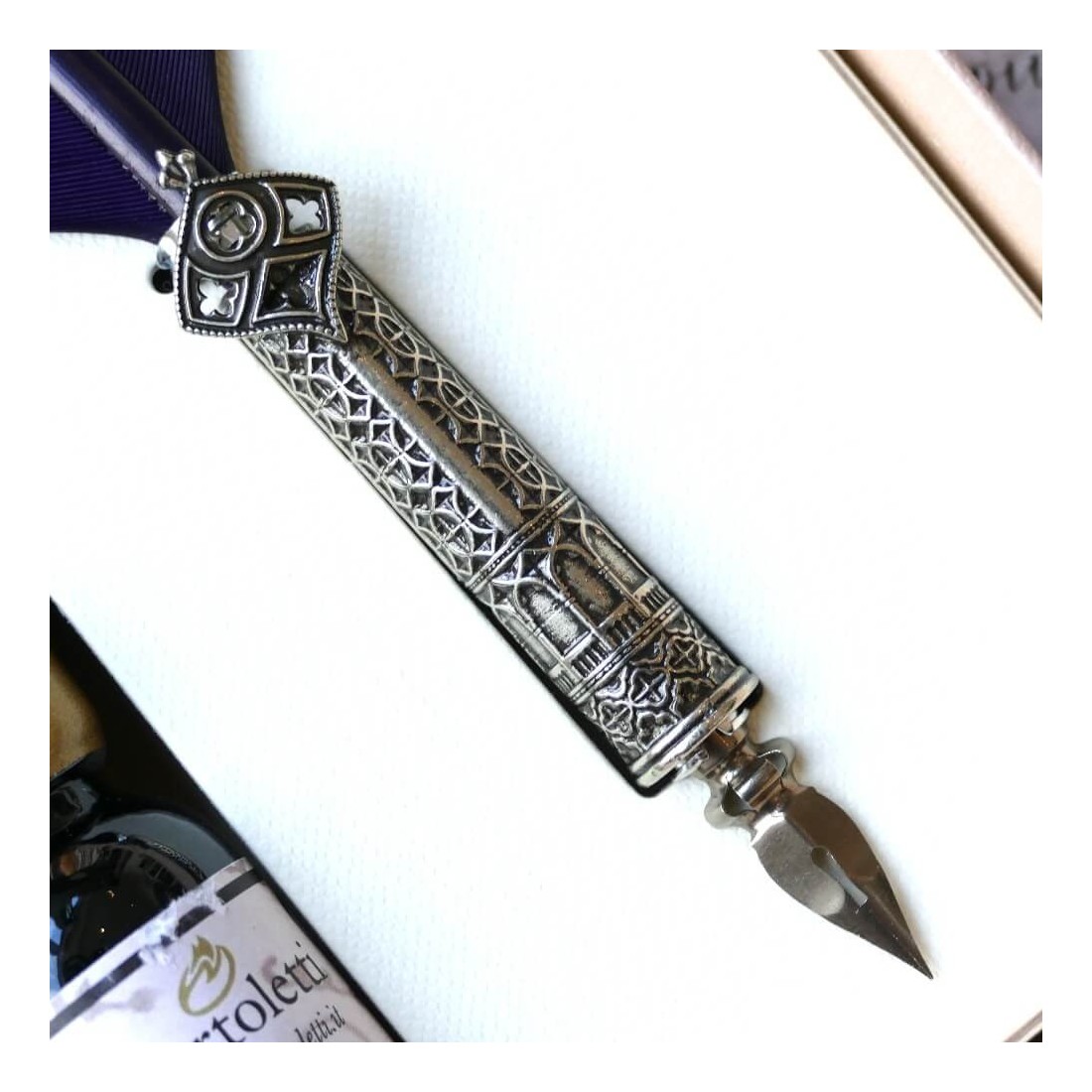 Pluma caligrafía pluma y tinta. Este conjunto se compone de una pluma de pluma de calabaza de pluma de ganso con plumín de bronce plateado en plata de níquel y una botella estándar de tinta. Fabricado en Italia por Bortoletti Fonderia Artistica.