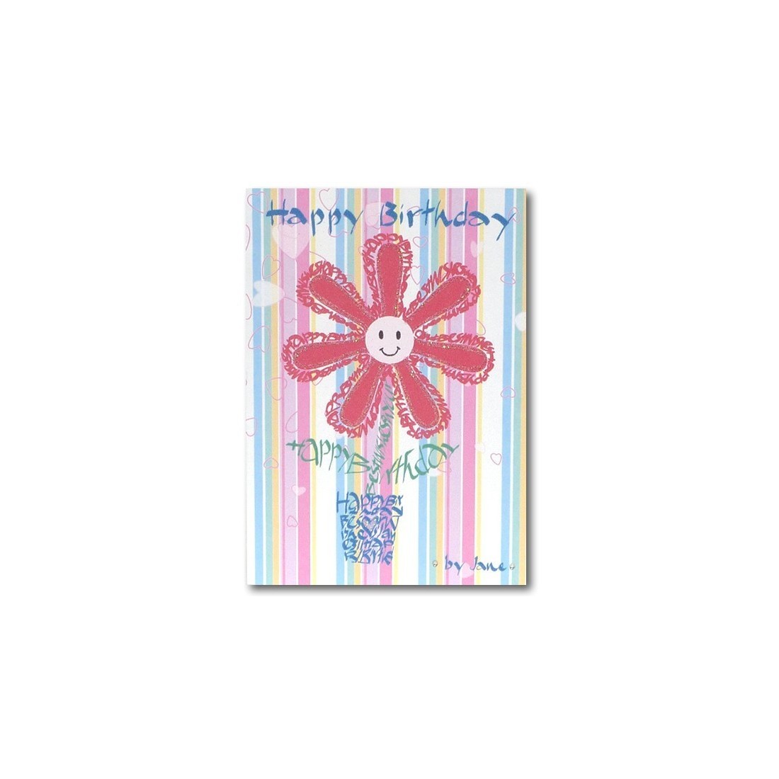 Una tarjeta de cumpleaños feliz única y hecha a mano creada en la forma de una flor linda margarita. Situado en una olla sobre un fondo de rayas con corazones. Diseñado con la caligrafía en las palabras y frases que celebran ese día tan especial. Esta hermosa tarjeta hecha a mano con diamantes colocados a ambos lados del texto en la parte inferior de la tarjeta. También tiene brillo alrededor de los pétalos y en el corazón de la maceta.