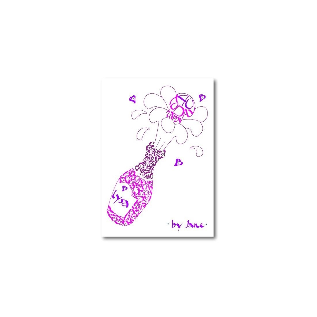 Una tarjeta única hecha a mano. Botella de champán de celebración que se puede personalizar con nombre y edad. Diseñado usando caligrafía en palabras y frases que celebran ese día especial. Brillos y diamantes hacen brillar esta hermosa tarjeta.