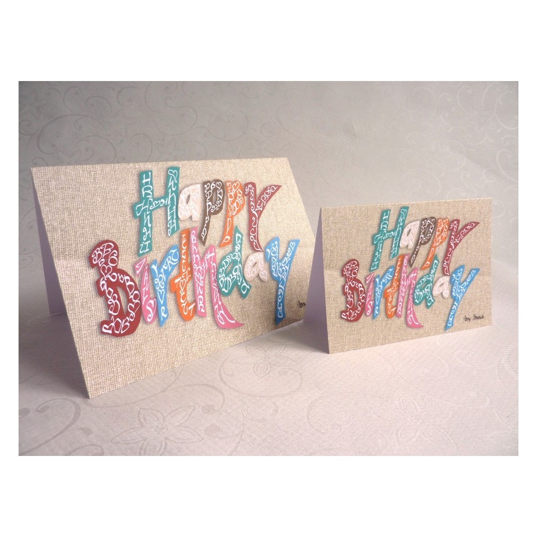 ¡Feliz cumpleaños! Una variante de color clásica de esta maravillosa tarjeta de cumpleaños. Los caracteres caligráficos multicolores se colocan sobre un fondo de arpillera.