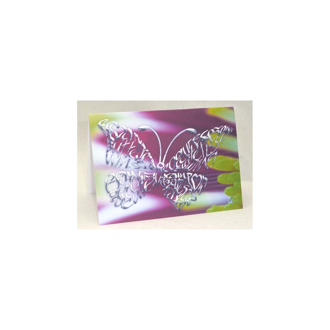 Una tarjeta de felicitación hermosa caligrafía, que muestra una mariposa con un efecto cromado acercarse a una flor morada. Este diseño maravilloso de la mariposa refleja la delicada belleza de nuestro jardín de verano amigos alados. Único, original y muy diferente de nuestras tarjetas habituales.