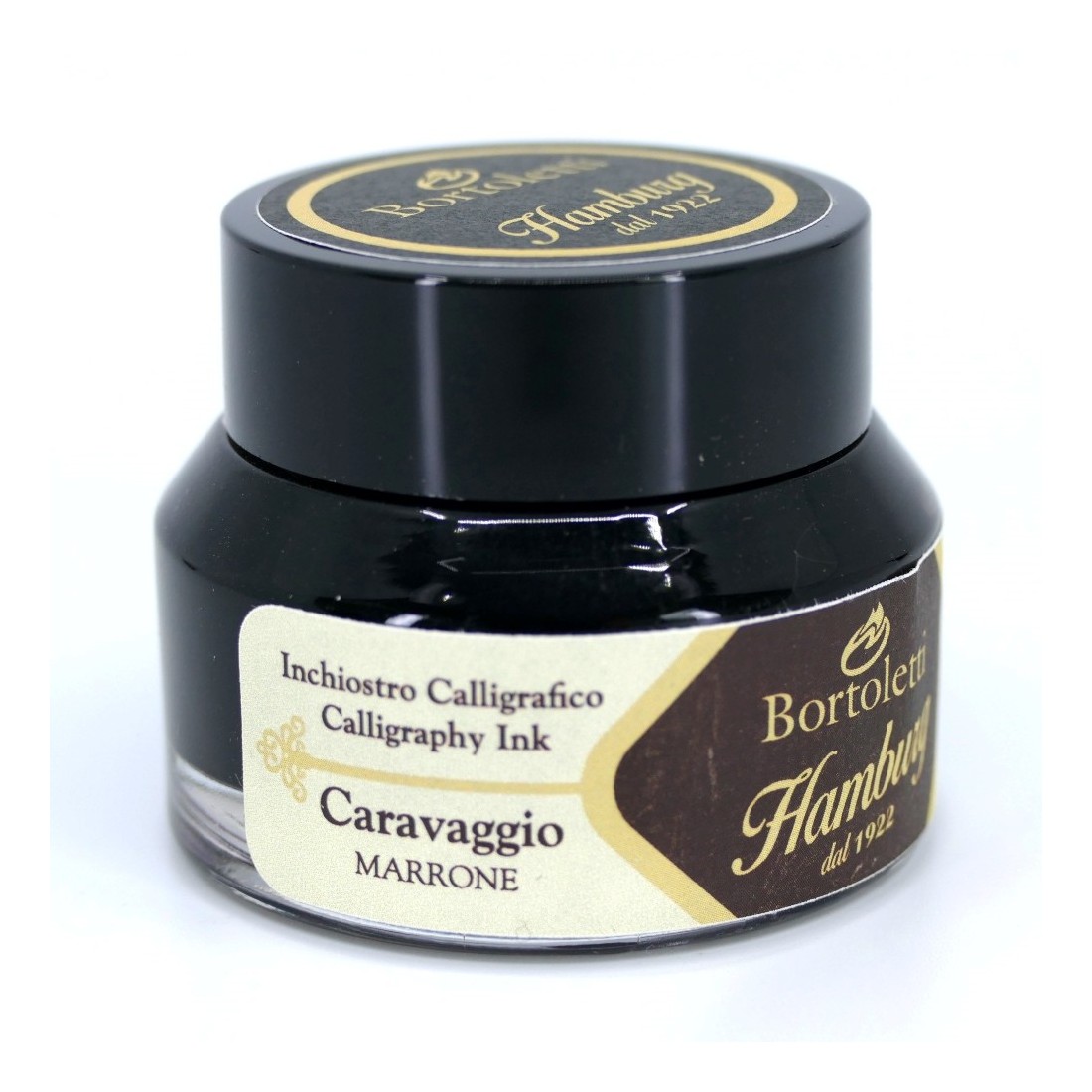 Una botella de tinta caligráfica italiana marrón de buena calidad (30 ml). Suministrada por Bortoletti. Marrón oscuro para esta tinta dedicada al alma inquieta del gran Caravaggio y a sus obras de tonalidades oscuras realzadas por puntos de luz casi violentos.