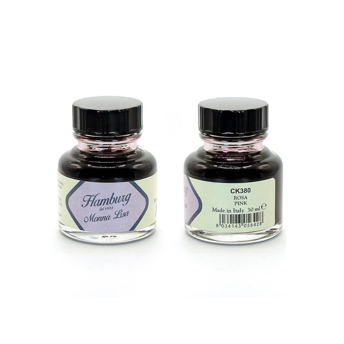 Una botella de tinta italiana rosa (30ml), fabricada por Hamburg. Una rosa con un toque antiguo y elegante para celebrar Mona Lisa, la figura femenina cuyo retrato es sin duda el más famoso de la historia.