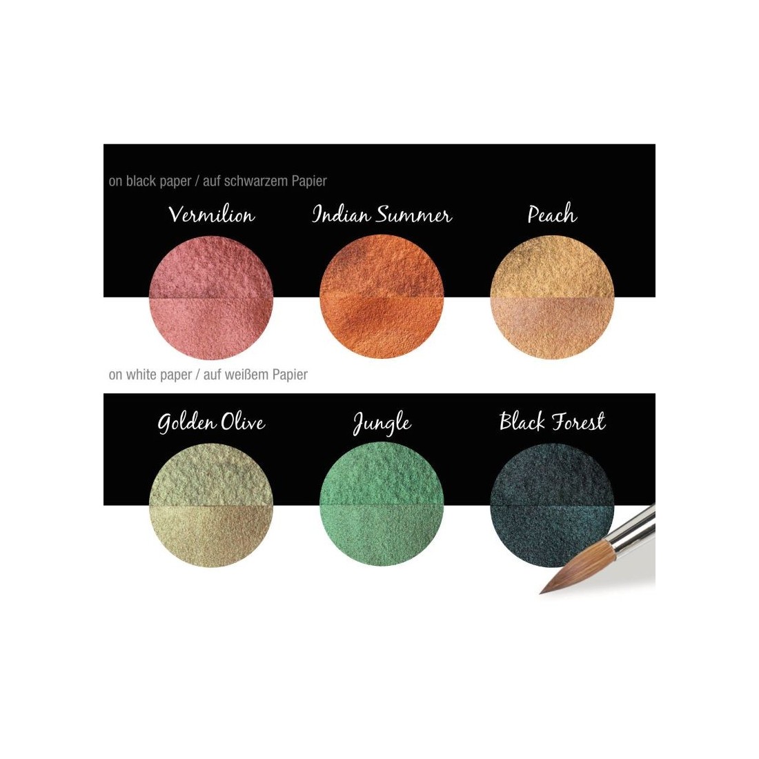 Valmistettu kiille, luonnon mineraali, joka tarjoaa laajan valikoiman metallinhohtosävyt, kulta ja hopea värikkäiden, loistava helmi värejä. Aktivoi hieman vettä paletti ja sovelletaan NIB harjalla. Noudatetaan kaikkia vaimennuspinta, kuten paperi, puu, kipsi, jne.