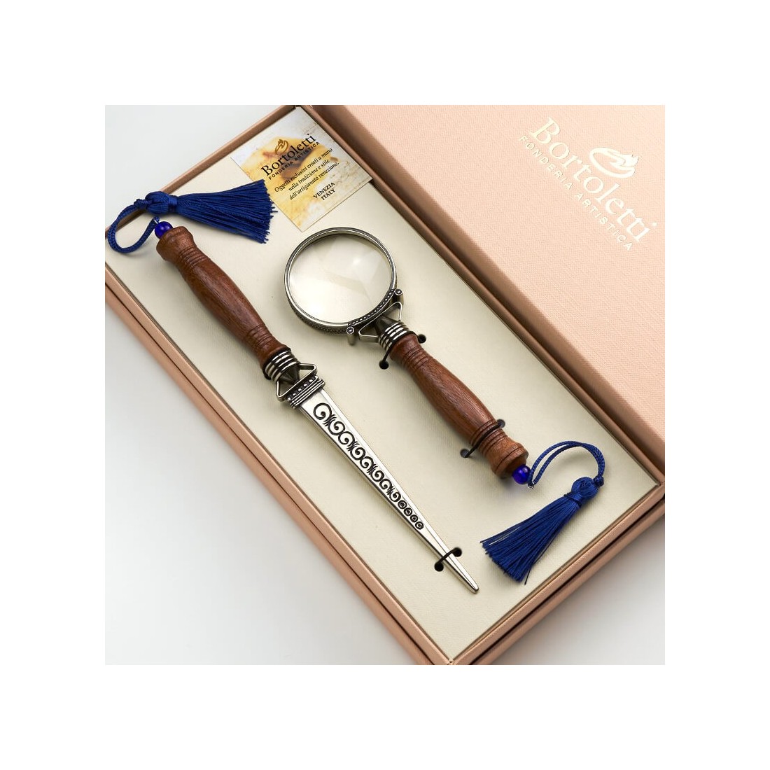 Täydellinen sarja kirjeenavaajaa ja suurennuslasia, jotka on valmistettu luonnonpuusta ja valkoisesta pronssista. Puun yksinkertaisuus setissä, josta tulee koristeellinen lisä työpöytääsi. Tyylikäs lahjaidea yksinkertaisella tyylillä. Puun lämpö, hienosti koristeltu ja käsin veistetty linssirengas luonnehtivat tämän Venetsiassa käsintehdyn täydellisen pöytätarvikesarjan ilmettä. Tyypillinen käsityötuote, joka liittyy läheisesti alkuperäpaikkaan ja sen perinteisiin.