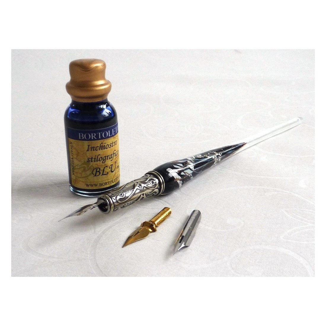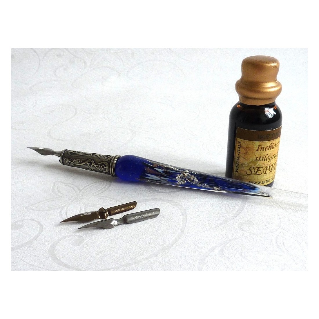 Kauniisti muotoiltu, viimeistelty käsin, kalligrafia dip kynäsetti, joka käsittää Muranon lasista kynää lehtihopea hiutaleita, kolme terät ja pullo mustetta. Saatavana erilaisia ihania värejä.