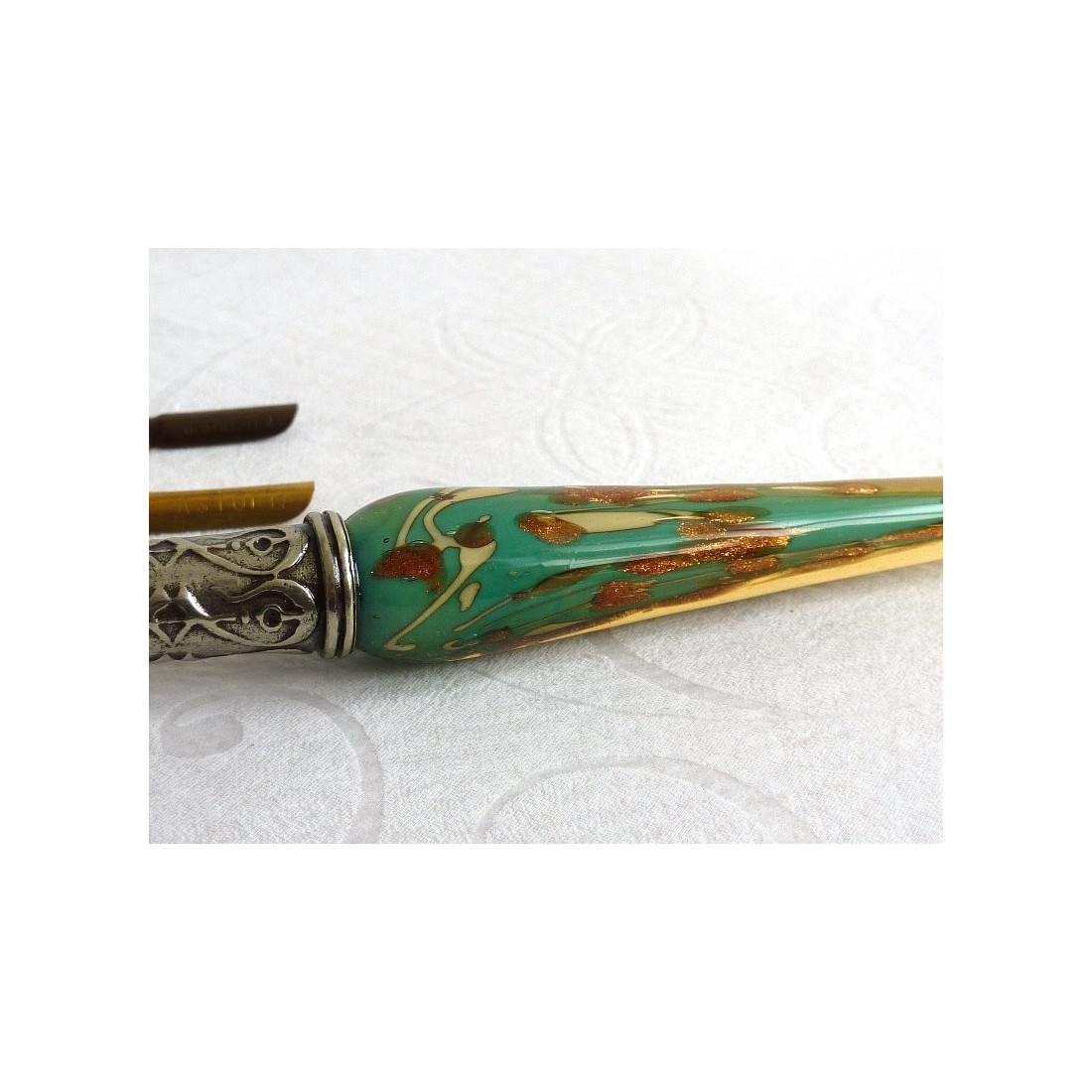 Kauniisti muotoiltu, viimeistelty käsin, kalligrafia dip kynäsetti, joka käsittää Muranon lasista kynä lehtikullalla hiutaleita, kolme terät ja pullo mustetta. Saatavana erilaisia ihania värejä.
