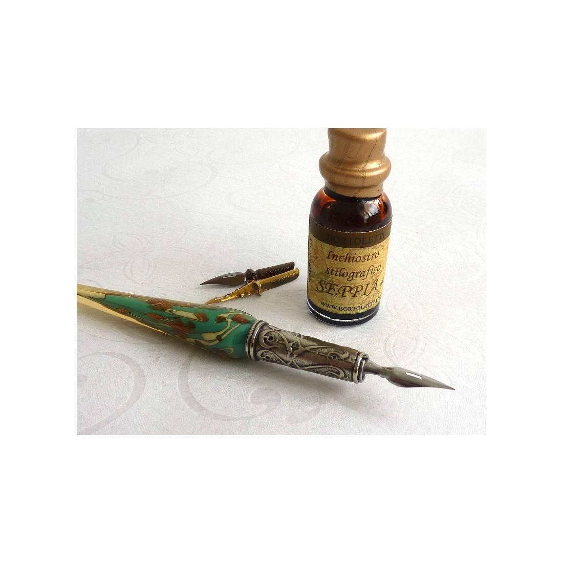 Lehtikullalla & lasi kynäsetti. Kauniisti muotoiltu, viimeistelty käsin, kalligrafiaa dip kynäsetti, joka käsittää Muranon lasista kynää lehtikullalla hiutaleet, kolme terät ja pullon mustetta. Saatavana eri ihania värejä. Valmistettu Italiassa Bortoletti Fonderia Artistica.