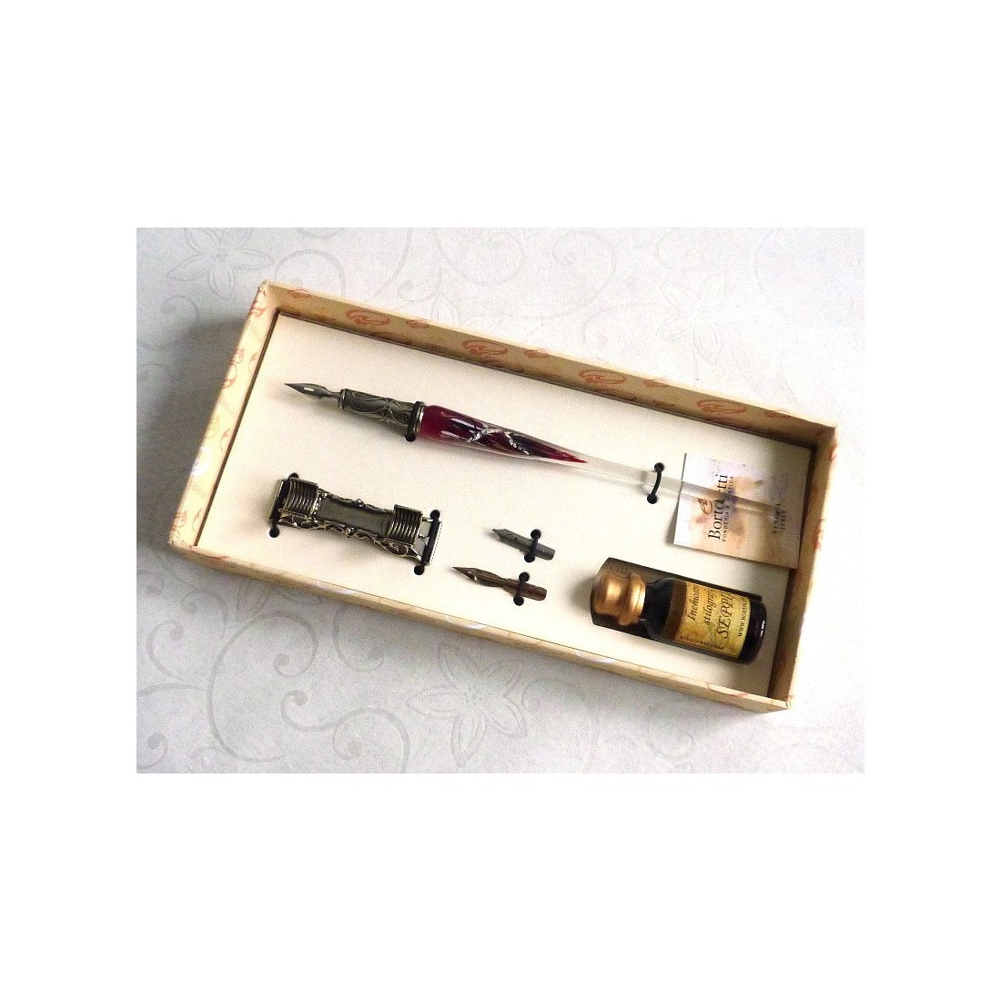 Hopea lehtiä ja lasi dip kynä. Kauniisti muotoiltu, viimeistelty käsin, kalligrafiaa dip kynä asettaa Muranon lasista ja hopea lehtiä. Käsittää lasi & nickle hopeoitu, pronssi dip kynä, kolme pomo ja koristeellinen kynä levätä. Saatavana eri väreissä. Valmistettu Italiassa Bortoletti Fonderia Artistica.