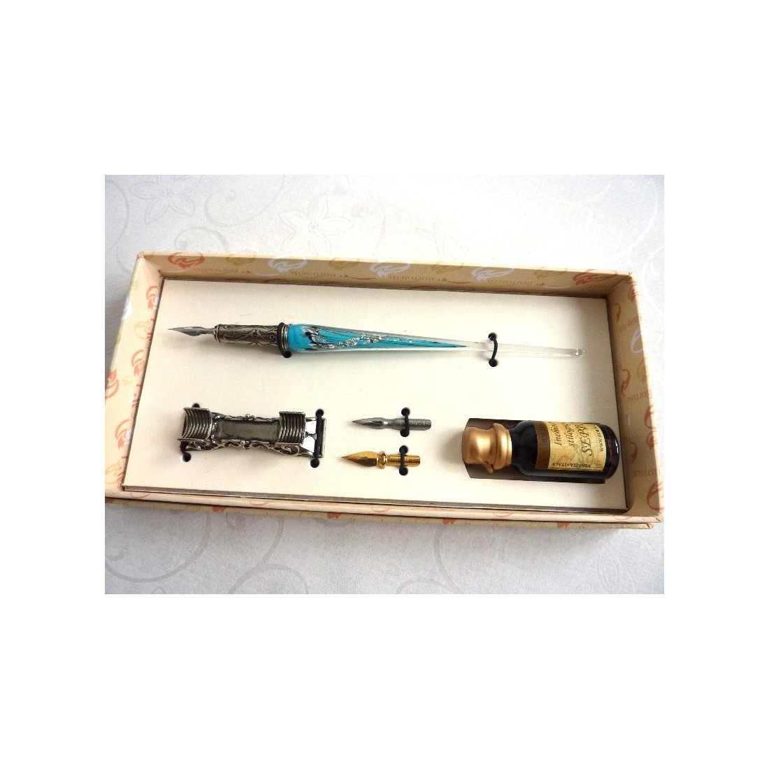 Hopea lehtiä ja lasi dip kynä. Kauniisti muotoiltu, viimeistelty käsin, kalligrafiaa dip kynä asettaa Muranon lasista ja hopea lehtiä. Käsittää lasi & nickle hopeoitu, pronssi dip kynä, kolme pomo ja koristeellinen kynä levätä. Saatavana eri väreissä. Valmistettu Italiassa Bortoletti Fonderia Artistica.