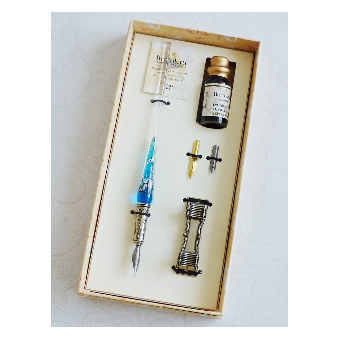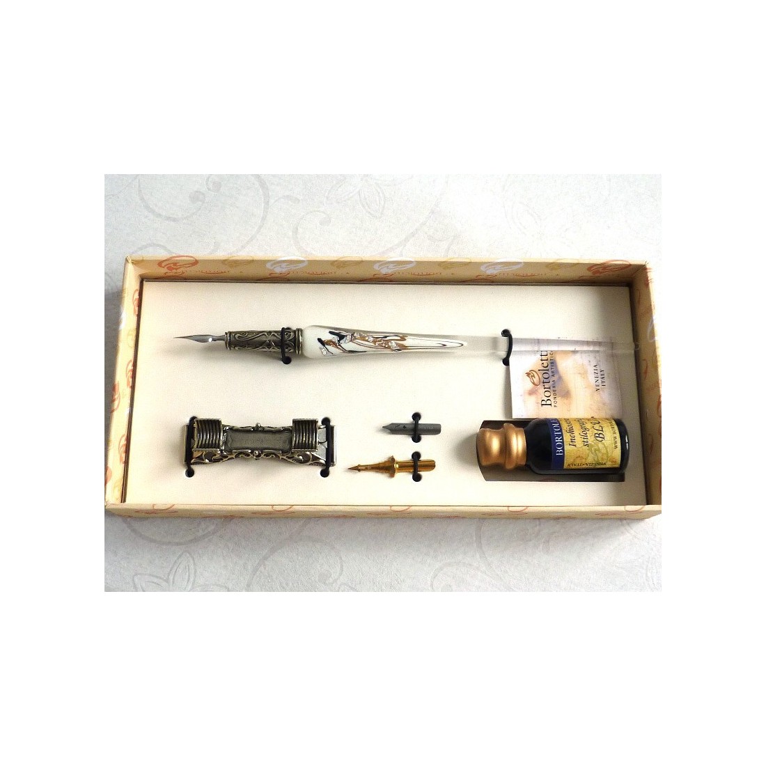 Hopea lehtiä ja lasi dip kynä. Kauniisti muotoiltu, viimeistelty käsin, kalligrafiaa dip kynä asettaa Muranon lasista ja hopea lehtiä. Käsittää lasi & nickle hopeoitu, pronssi dip kynä, kolme pomo ja koristeellinen kynä levätä. Saatavana eri väreissä. Valmistettu Italiassa Bortoletti Fonderia Artistica.
