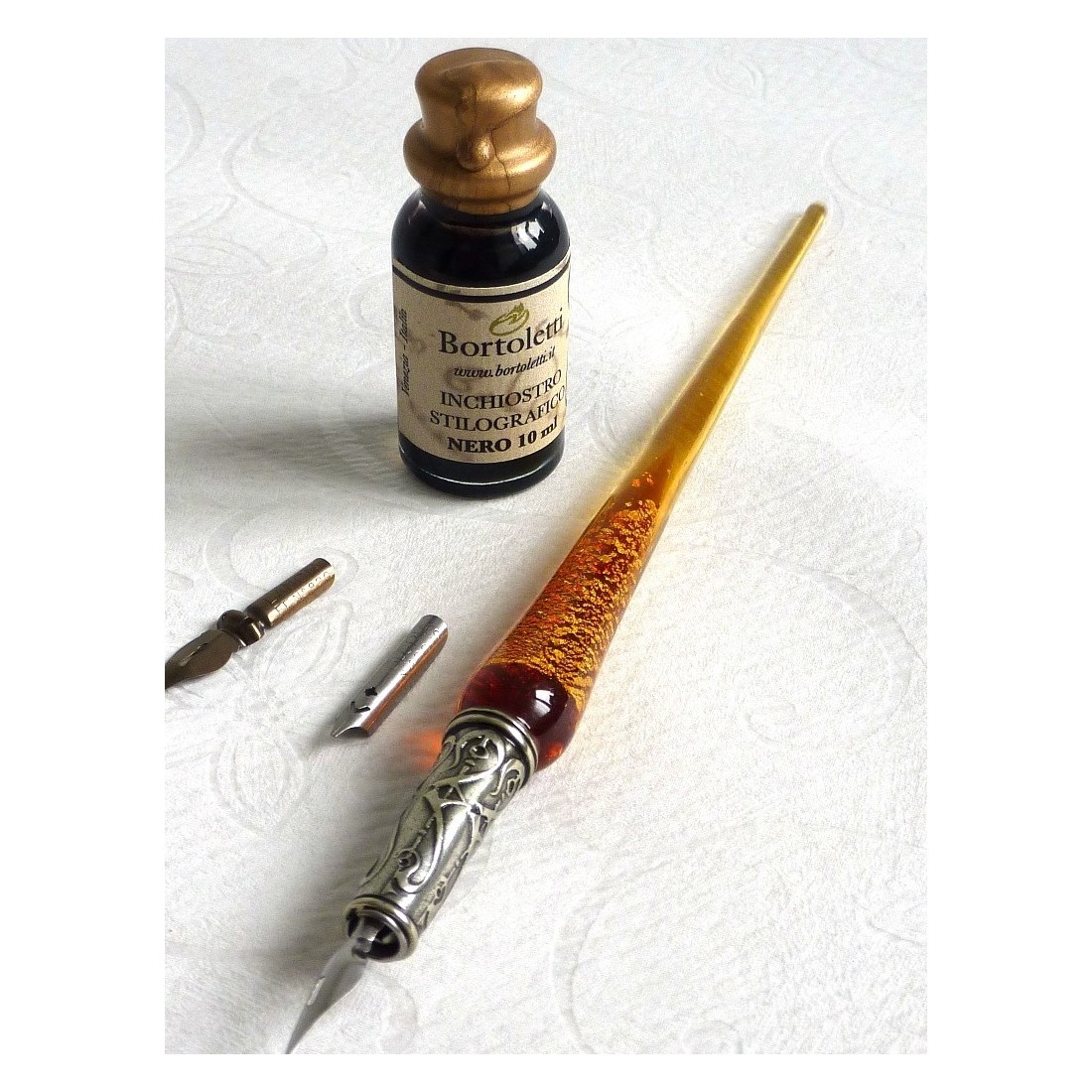 Kauniisti muotoiltu, käsin viimeistelty kalligrafia-kastekynä. Sisältää Muranon lasikynän, jossa on kultalehtihiutaleet, kolme kärkeä ja pullo mustetta. Saatavana useina upeina väreinä.