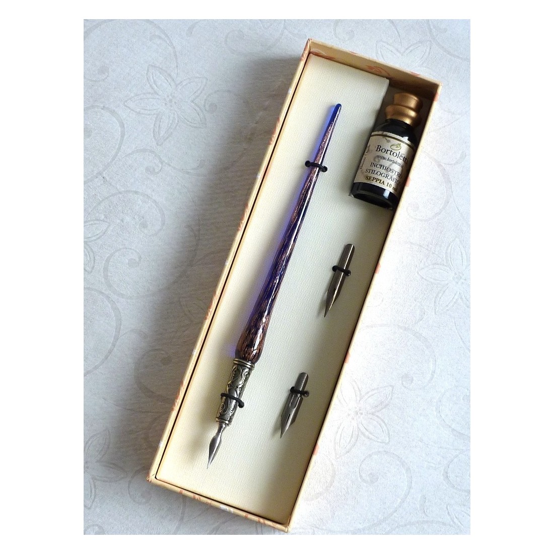 Kuparikiteet ja lasikynäsetti. Kauniisti muotoiltu, käsin viimeistelty kalligrafia-kastekynä, joka sisältää Murano Aventurine -kvartsilasikynän upotettuna kuparikiteillä. Mukana on myös kolme kärkeä ja pullo mustetta. Saatavana useina upeina väreinä.